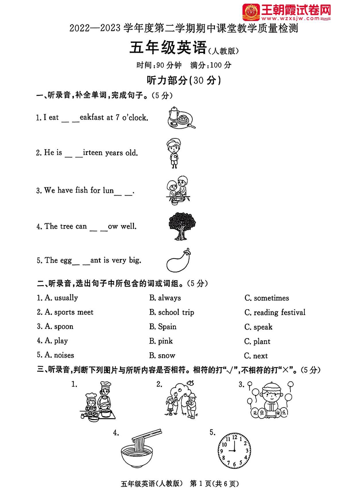五年级英语人教PEP版(三起始)下册期中卷
