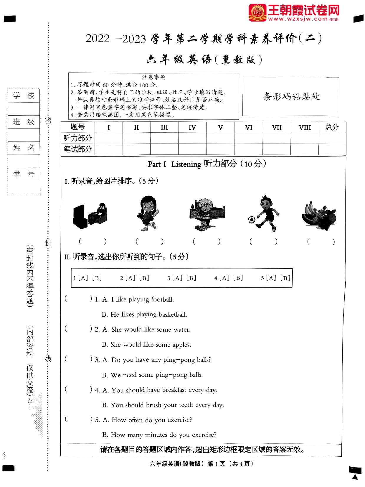 六年级英语冀教版下册期中卷