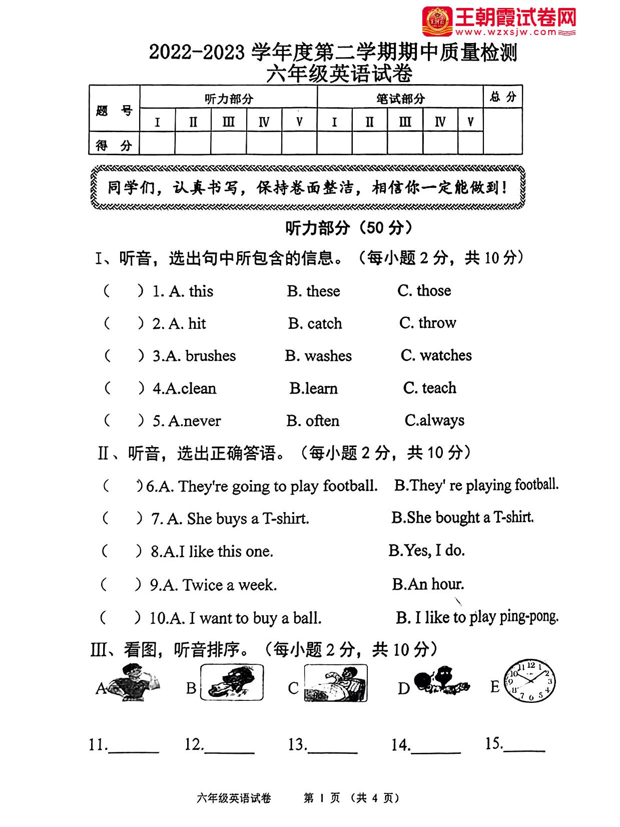 河北省秦皇岛市抚宁区2022-2023学年度第二学期期中质量检测试卷六年级英语(冀教版)