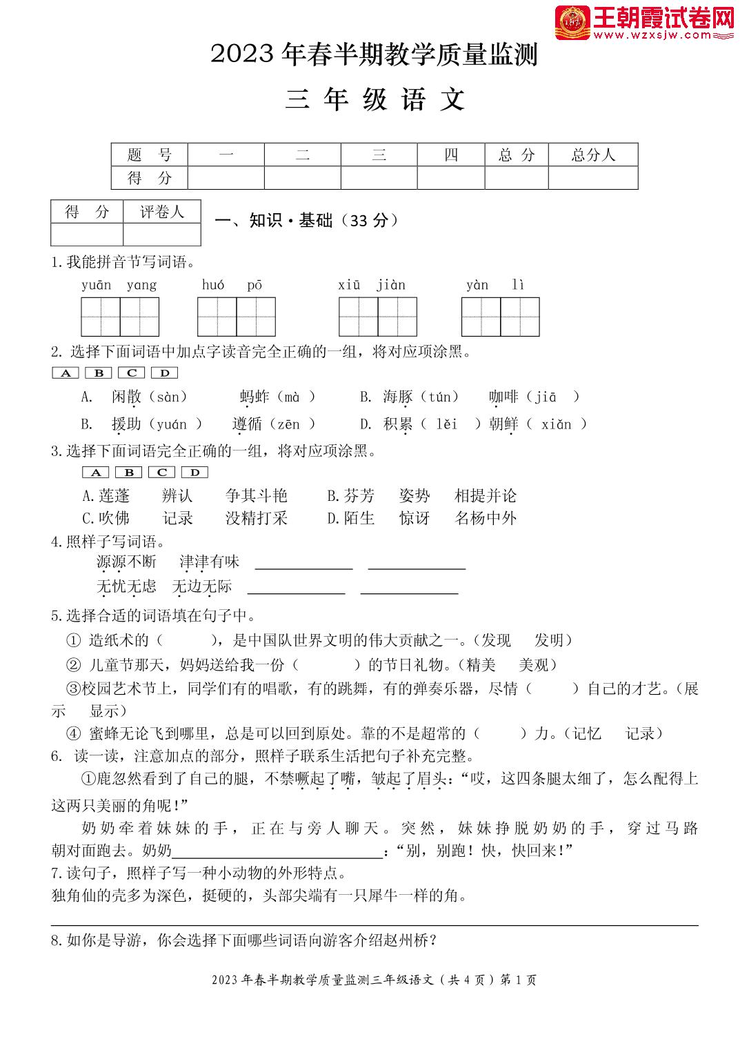 四川省绵阳市盐亭县2022-2023学年下学期期中教学质量监测三年级语文(人教版)