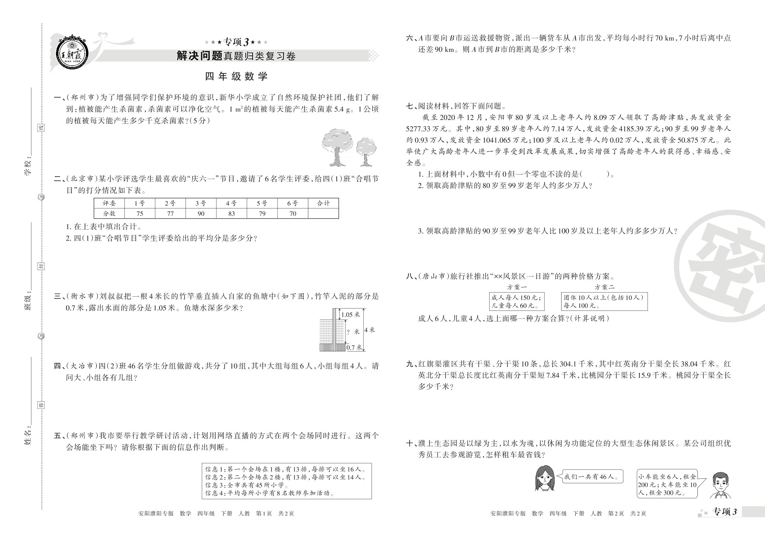 王朝霞期末专项卷——解决问题真题归类复习、新颖题速递:生活与数学四年级下册数学(人教版)_R210804134256【0】