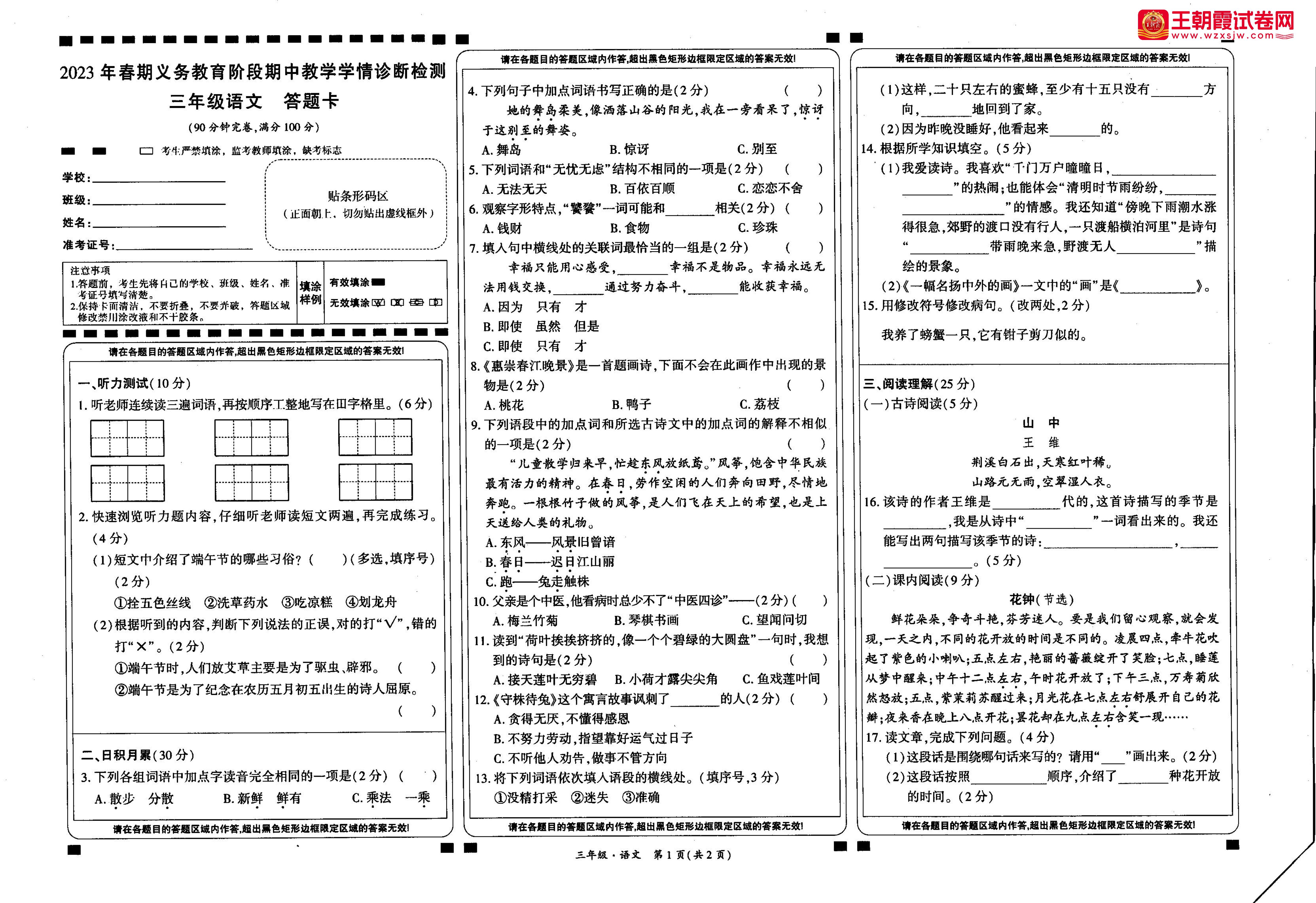 四川省宜宾市兴文县2022-2023学年下学期期中学情诊断检测三年级语文(人教版)