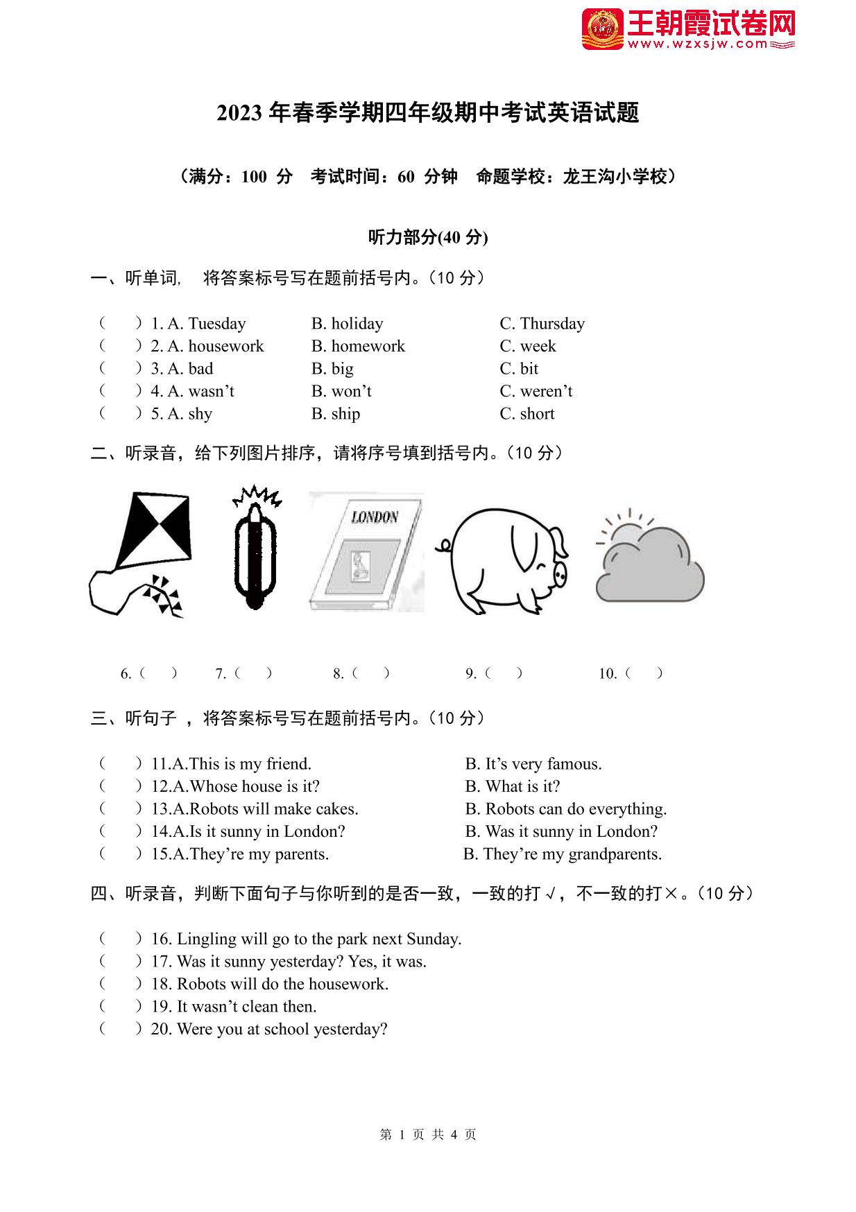 四川省广元市苍溪县2022-2023学年下学期期中考试四年级英语(外研版)【无听力音频】