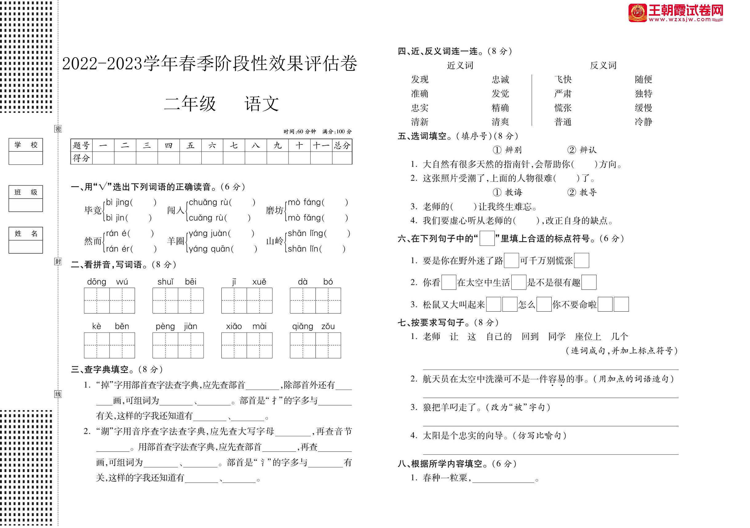 二年级语文人教版下册月考卷