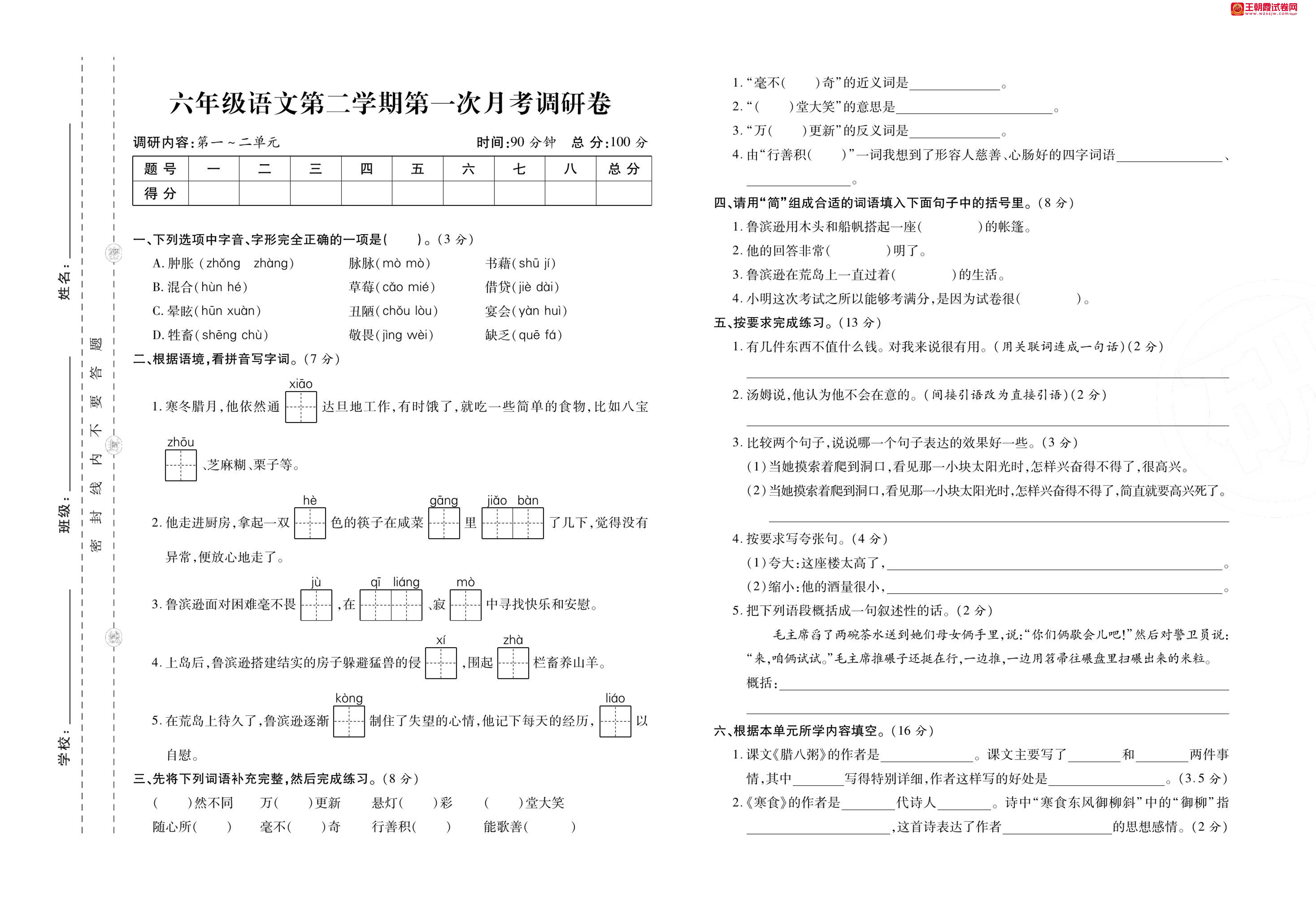 甘肃省定西市岷县西寨九年制学校2022-2023学年下学期第一次月考试题六年级语文(人教版)
