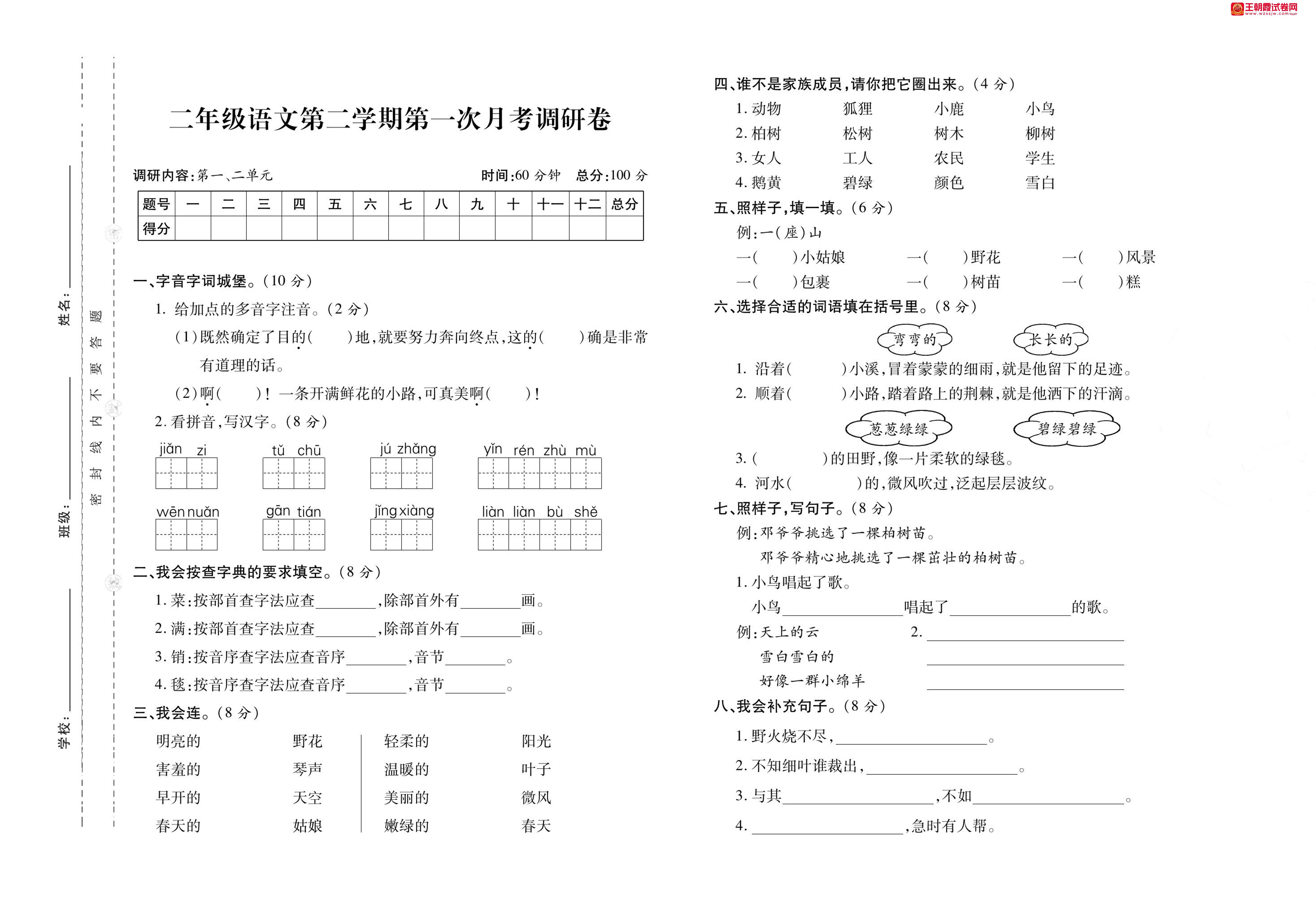 甘肃省定西市岷县西寨九年制学校2022-2023学年下学期第一次月考试题二年级语文(人教版)
