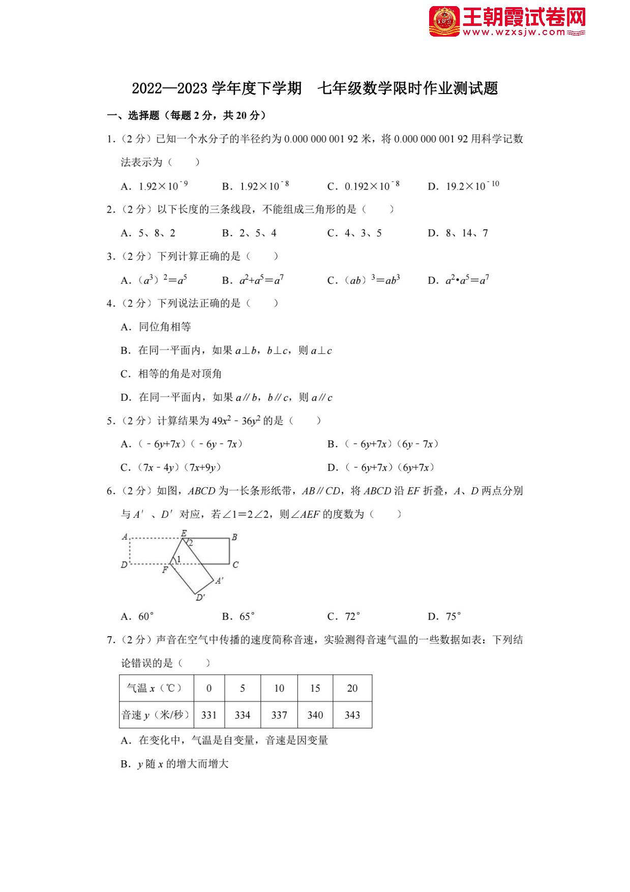 辽宁省沈阳市第一三四中学2022-2023学年下学期期中考试试题七年级数学(北师版)