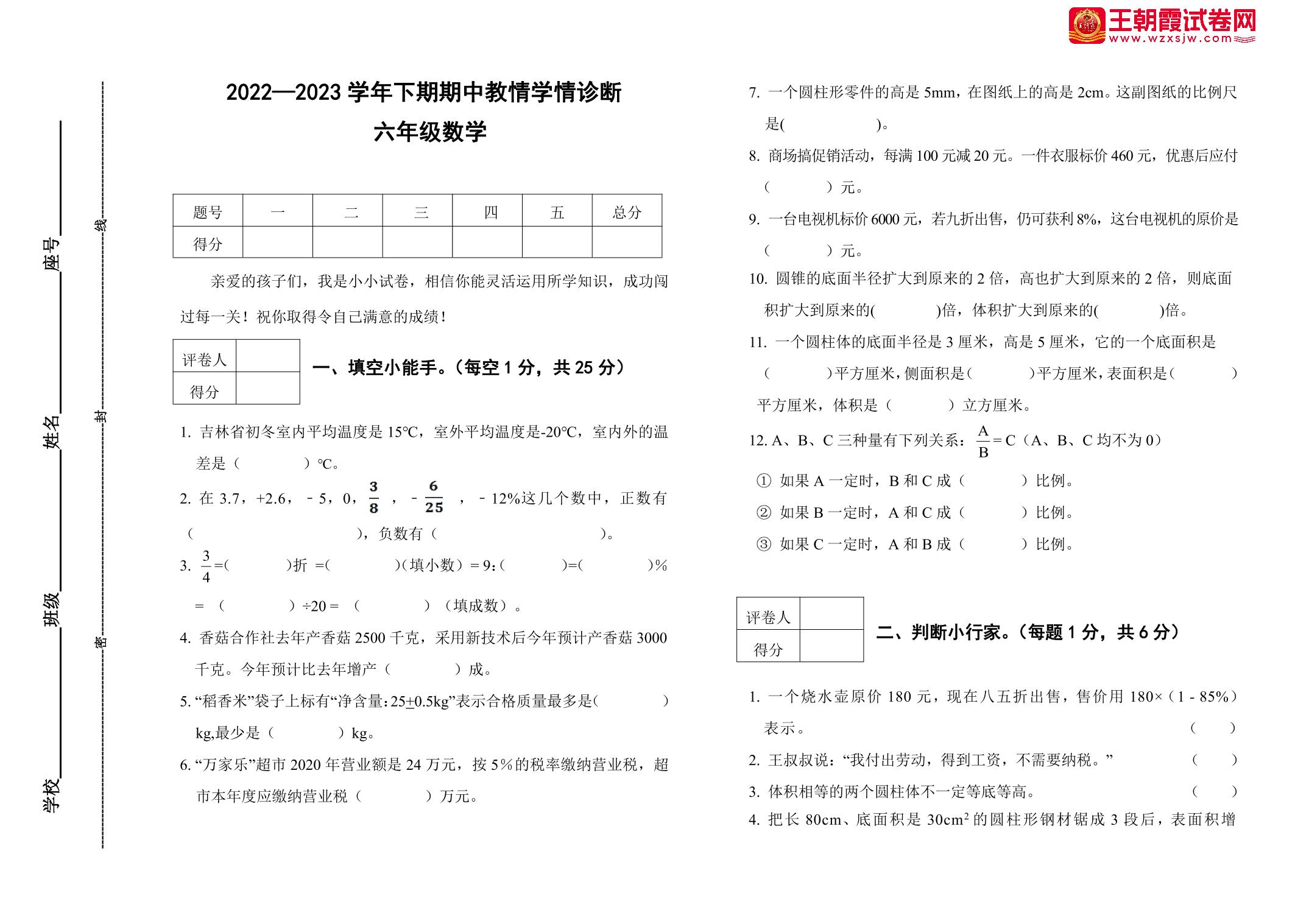 河南省三门峡市陕州区2022—2023学年下学期期中考试试题六年级数学(人教版)