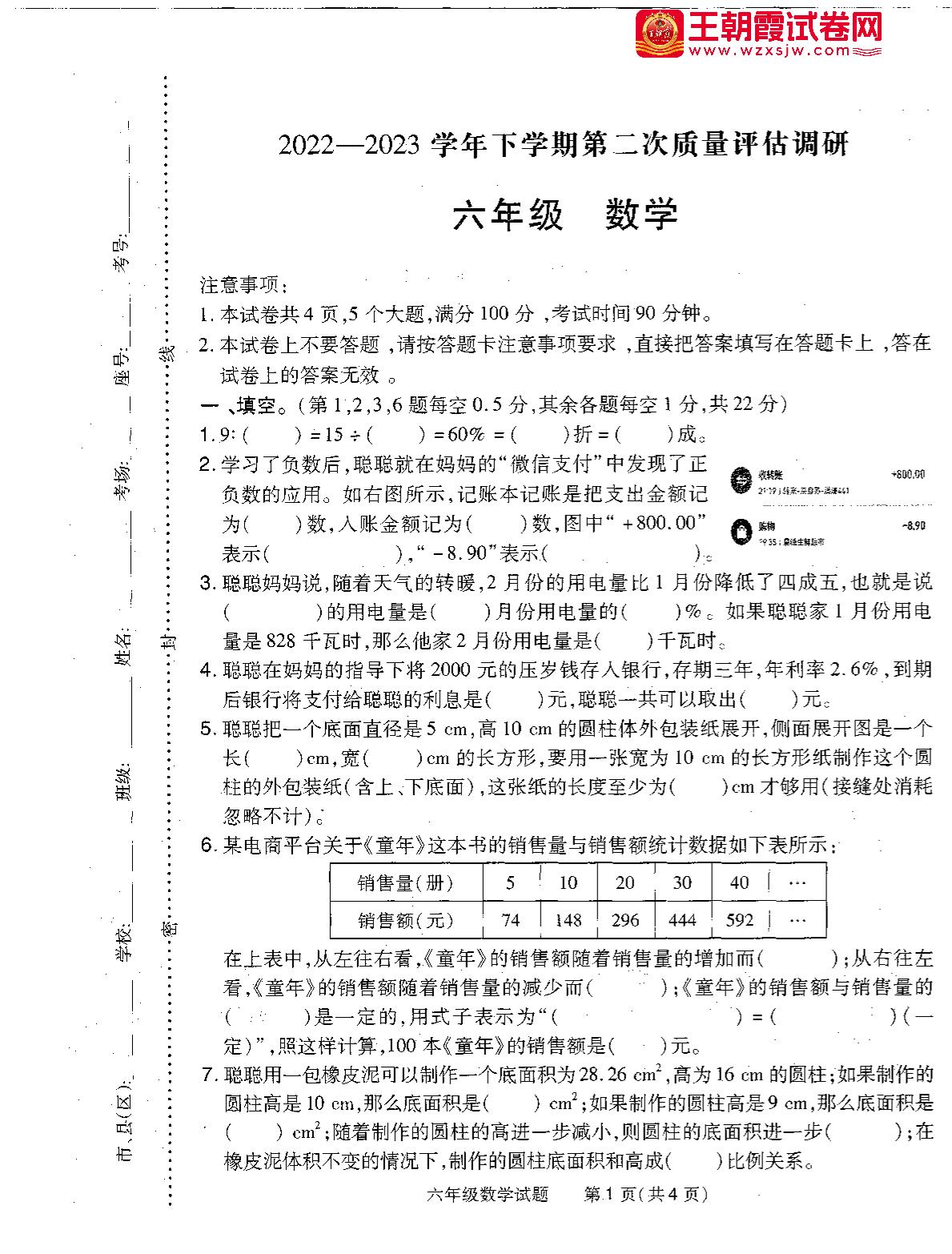 河南省信阳市平桥区部分学校2022—2023学年下学期4月期中试题六年级数学(人教版)