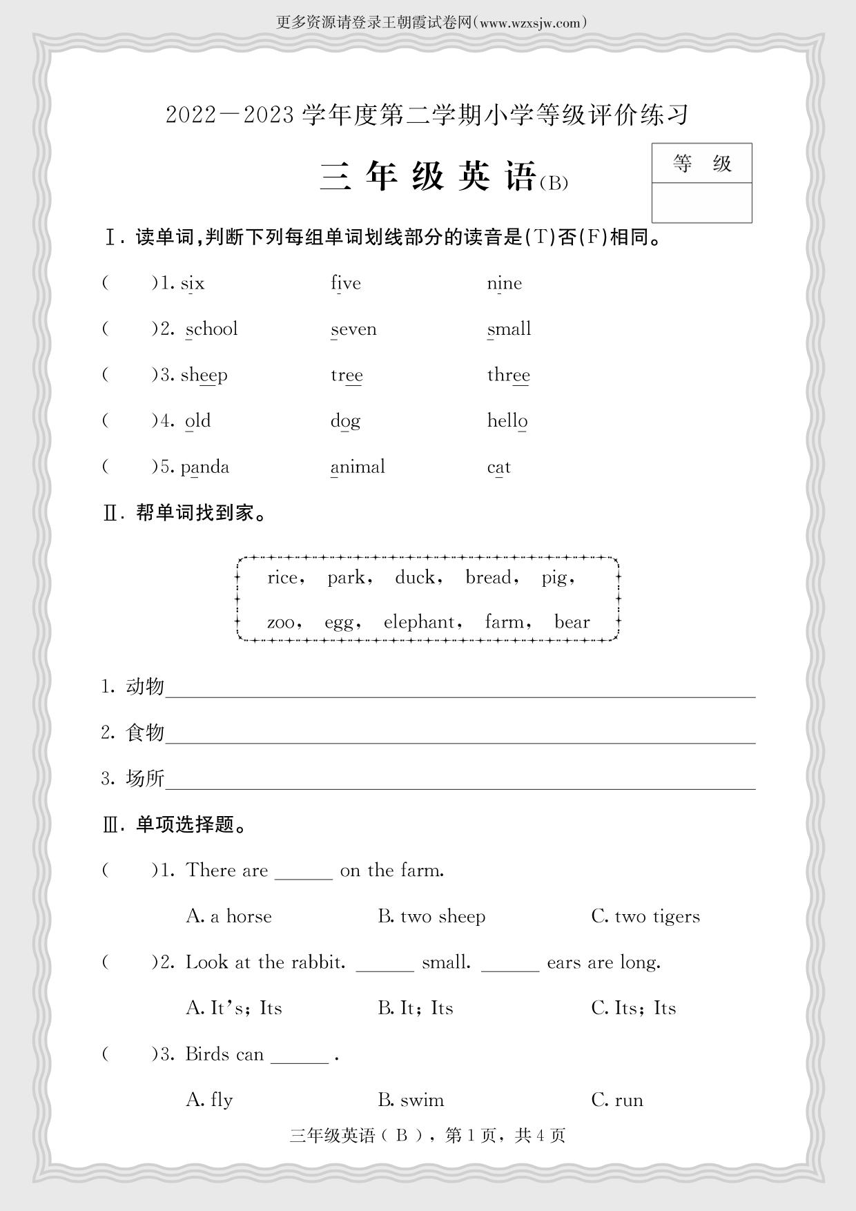 河北省石家庄市高邑县2022-2023学年度第二学期小学等级评价练习期中试卷三年级英语(冀教版)