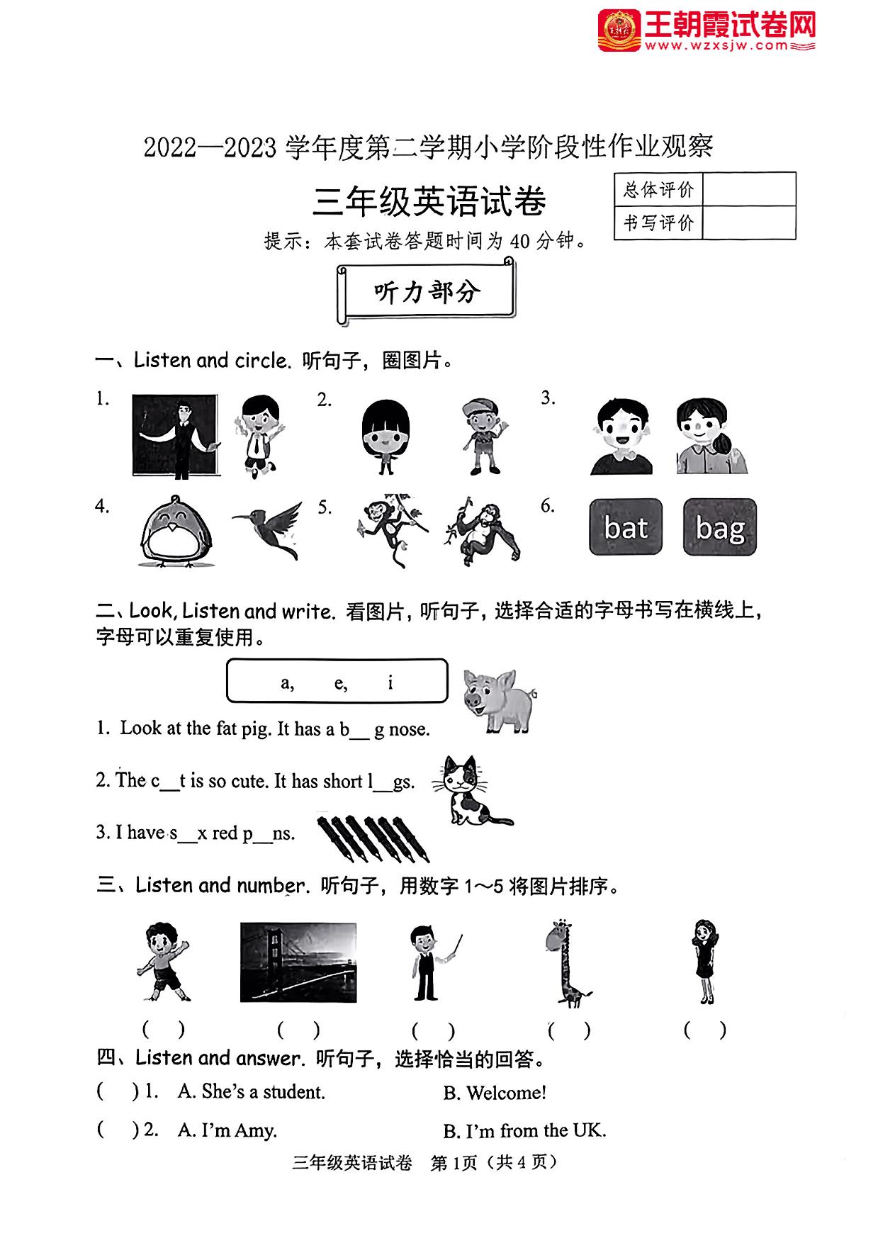 河北省唐山市迁安市2022-2023学年度第二学期期中阶段性作业观察三年级英语(人教PEP版)【无听力音频】