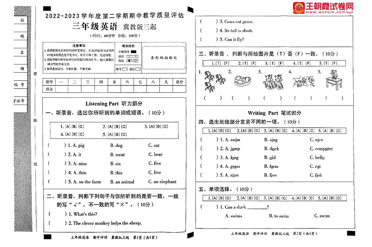 三年级英语冀教版下册期中卷