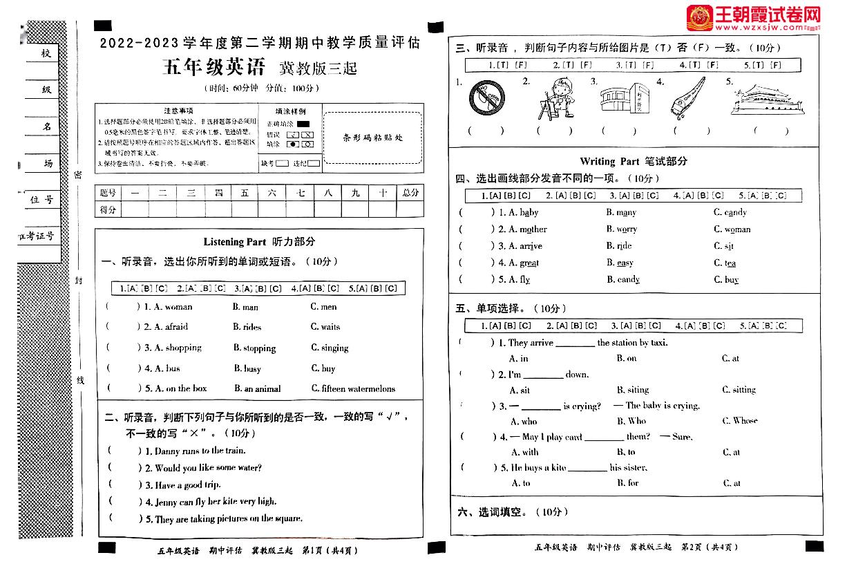 河北省邢台市威县2022-2023学年度第二学期期中教学质量评估五年级英语(冀教版)【无听力音频】