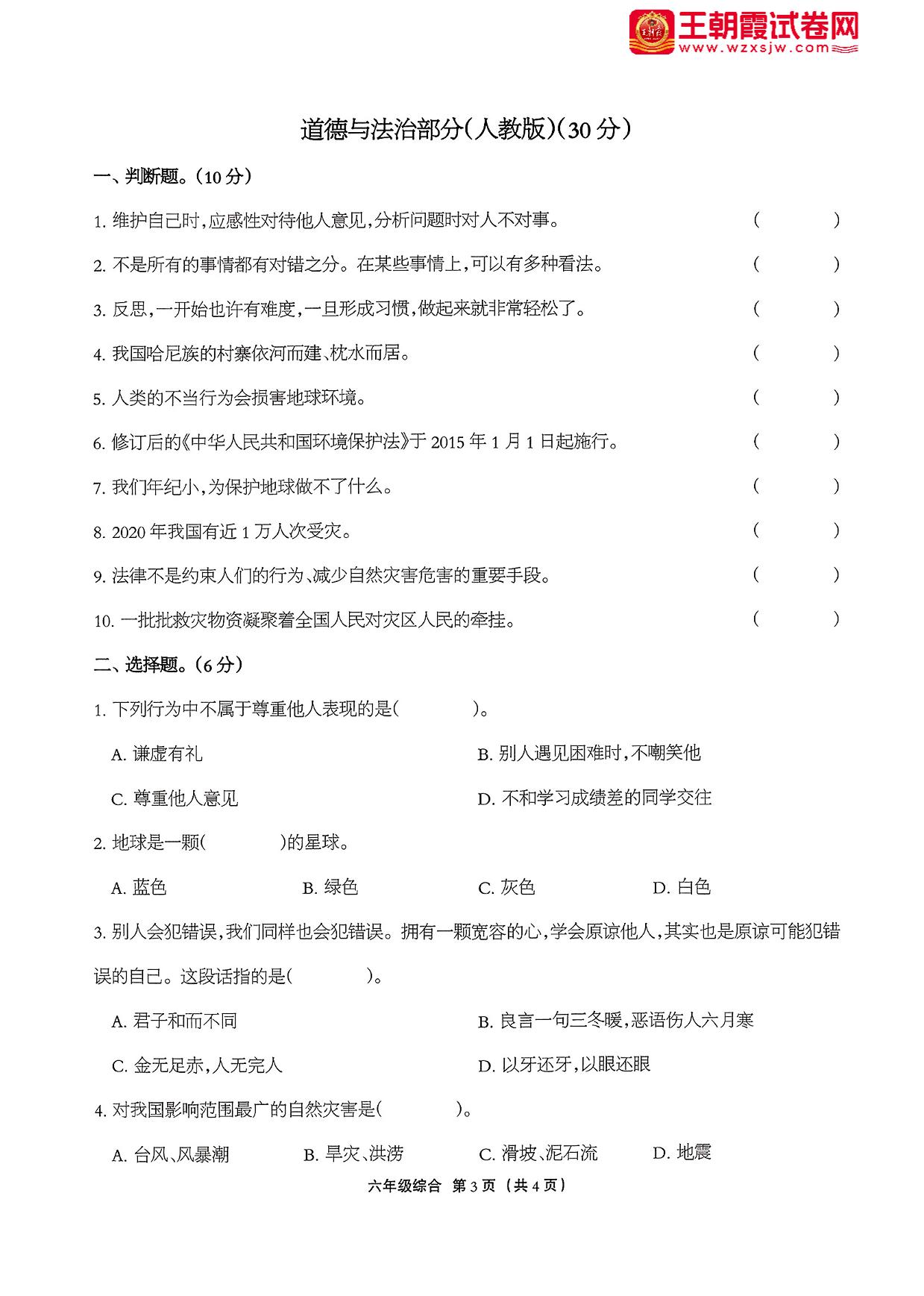 河北省保定市阜平县2022-2023学年第二学期期中学科素养评价六年级道德与法治(人教版)