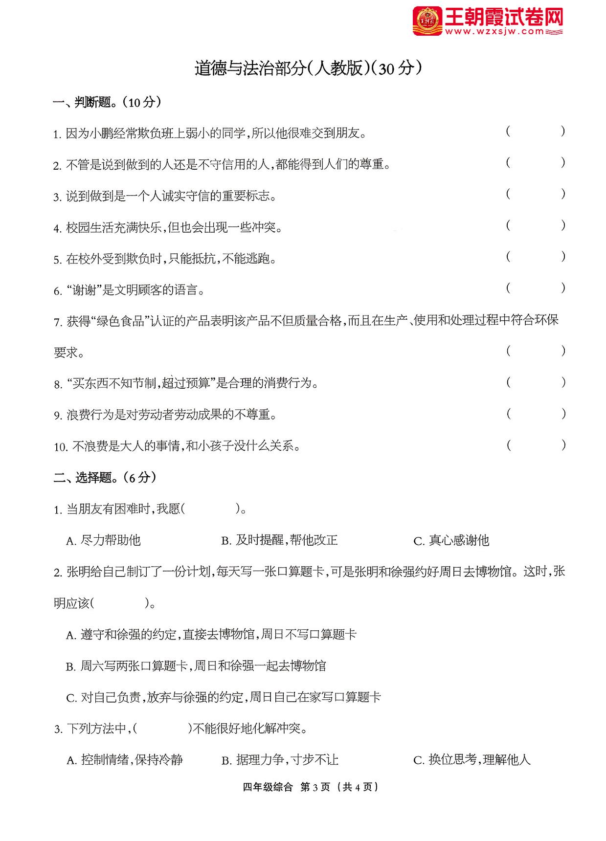 四年级道德与法治人教版下册期中卷