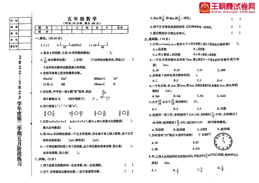 五年级数学北师版下册月考卷