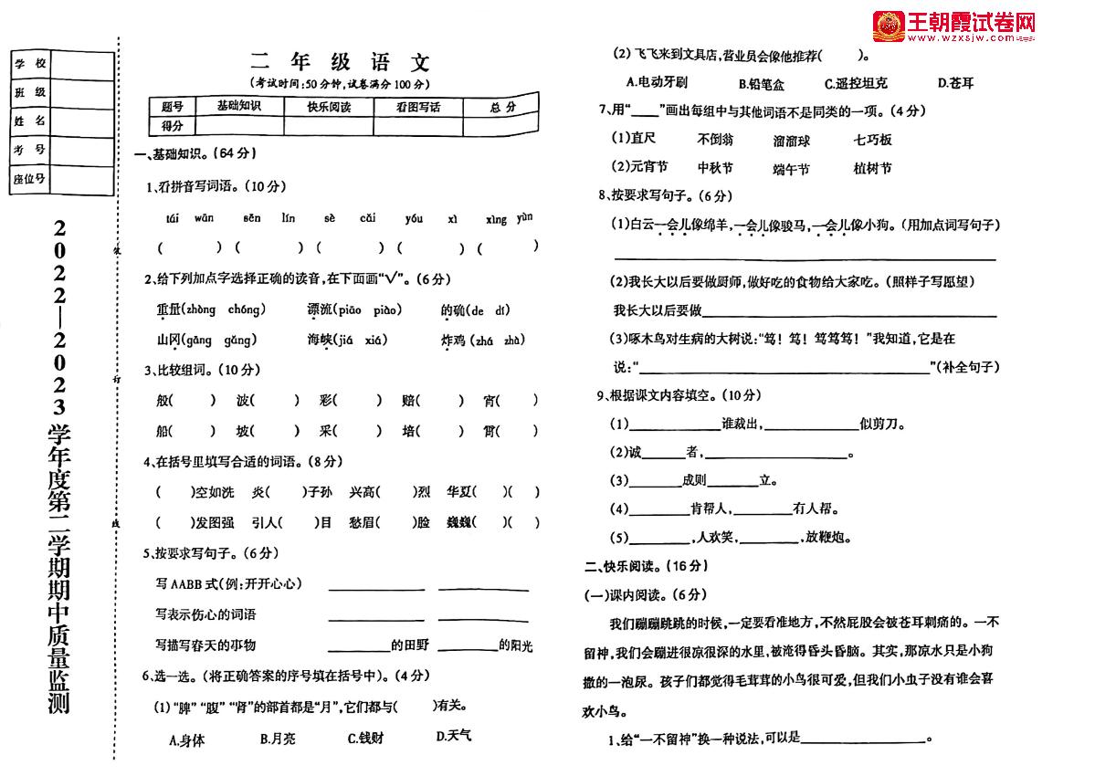 辽宁省鞍山市海城市2022-2023学年下学期期中质量监测二年级语文(人教版)
