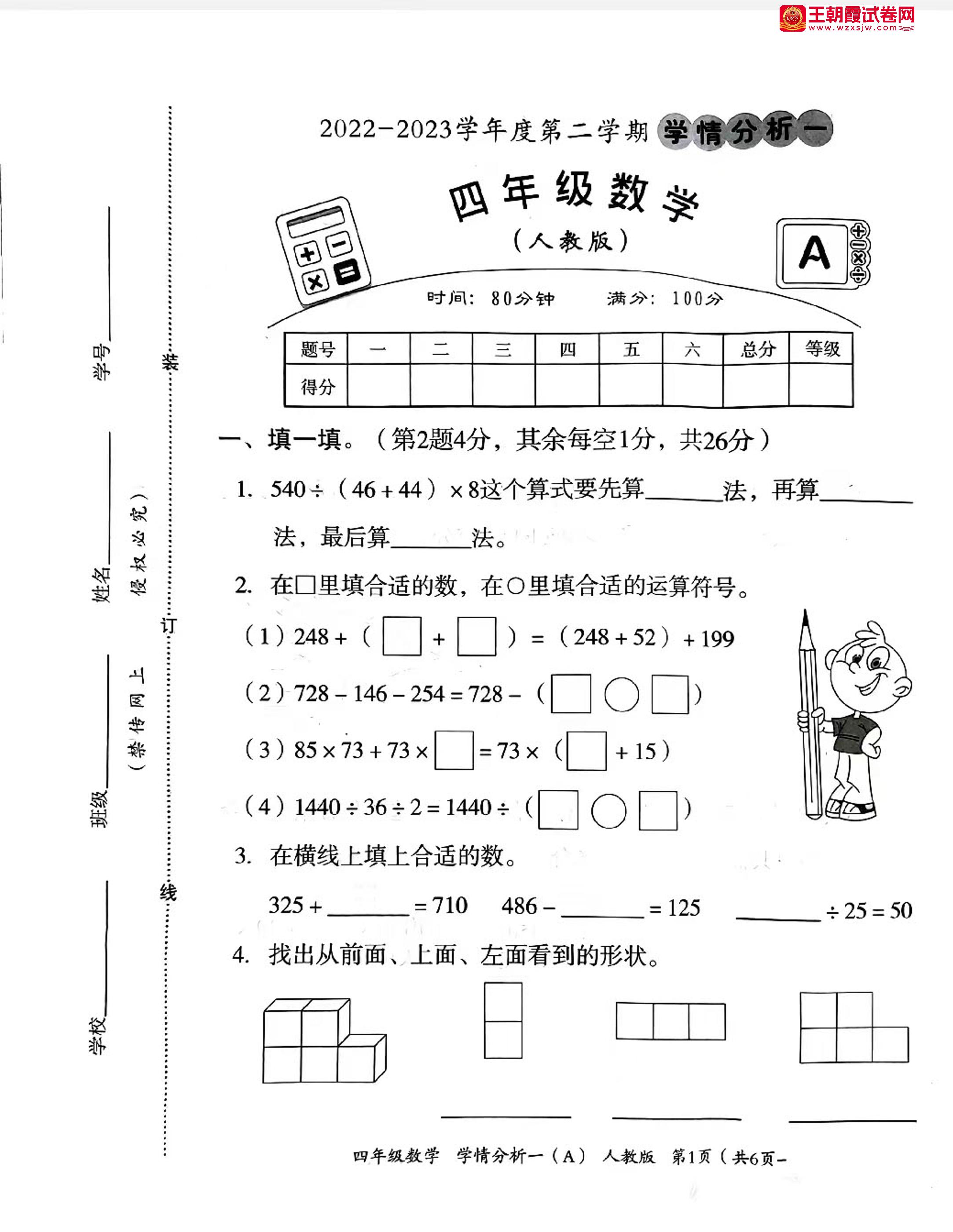四年级数学人教版下册月考卷