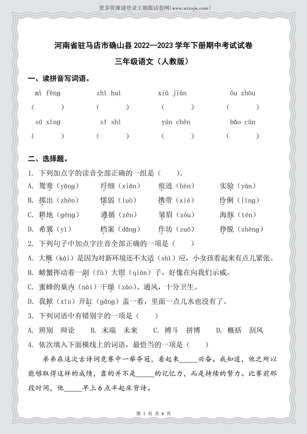 河南省驻马店市确山县2022—2023学年下册期中考试试卷三年级语文(人教版)