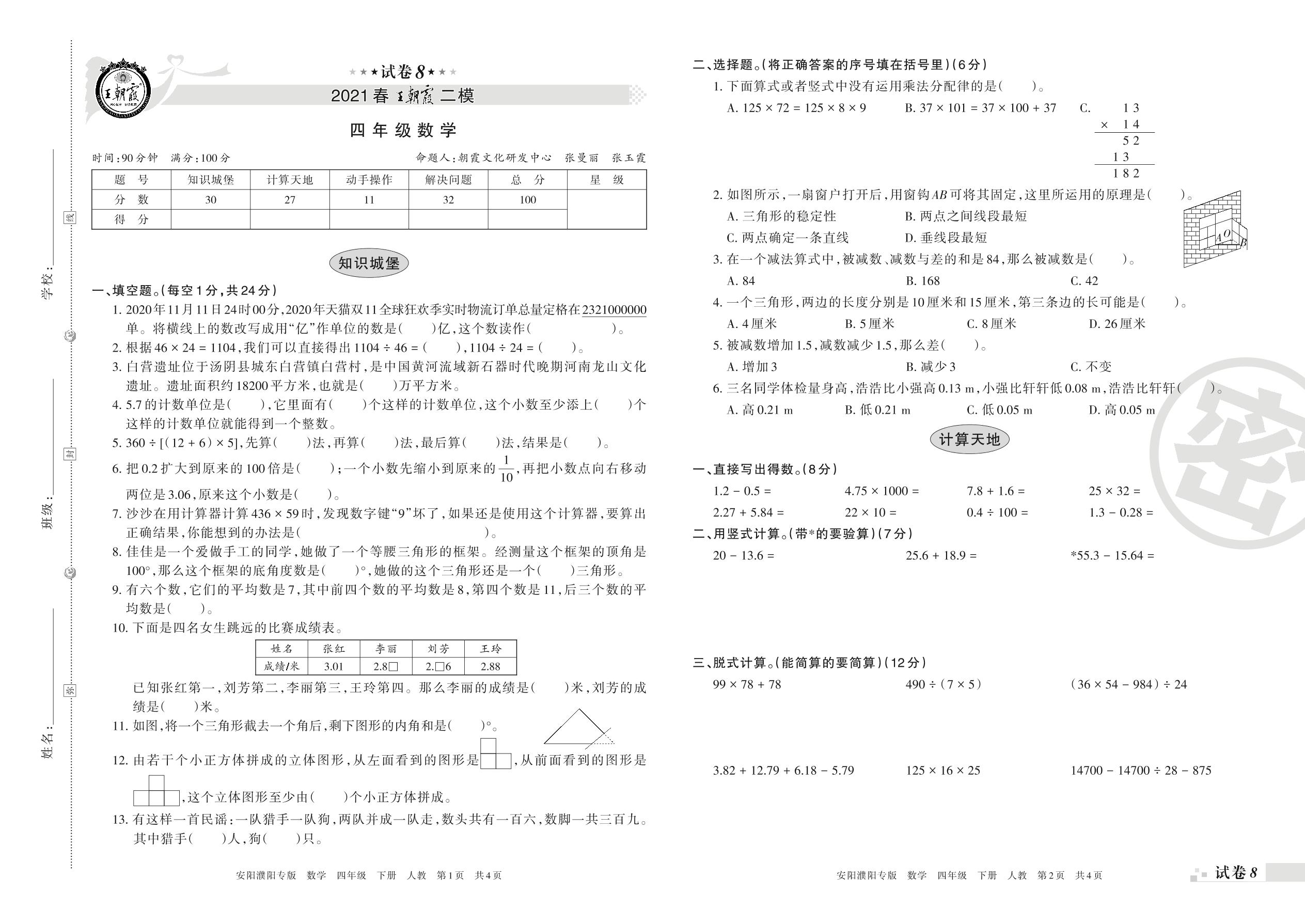 王朝霞期末模拟卷四年级下册数学(人教版)_R210804134340【8】
