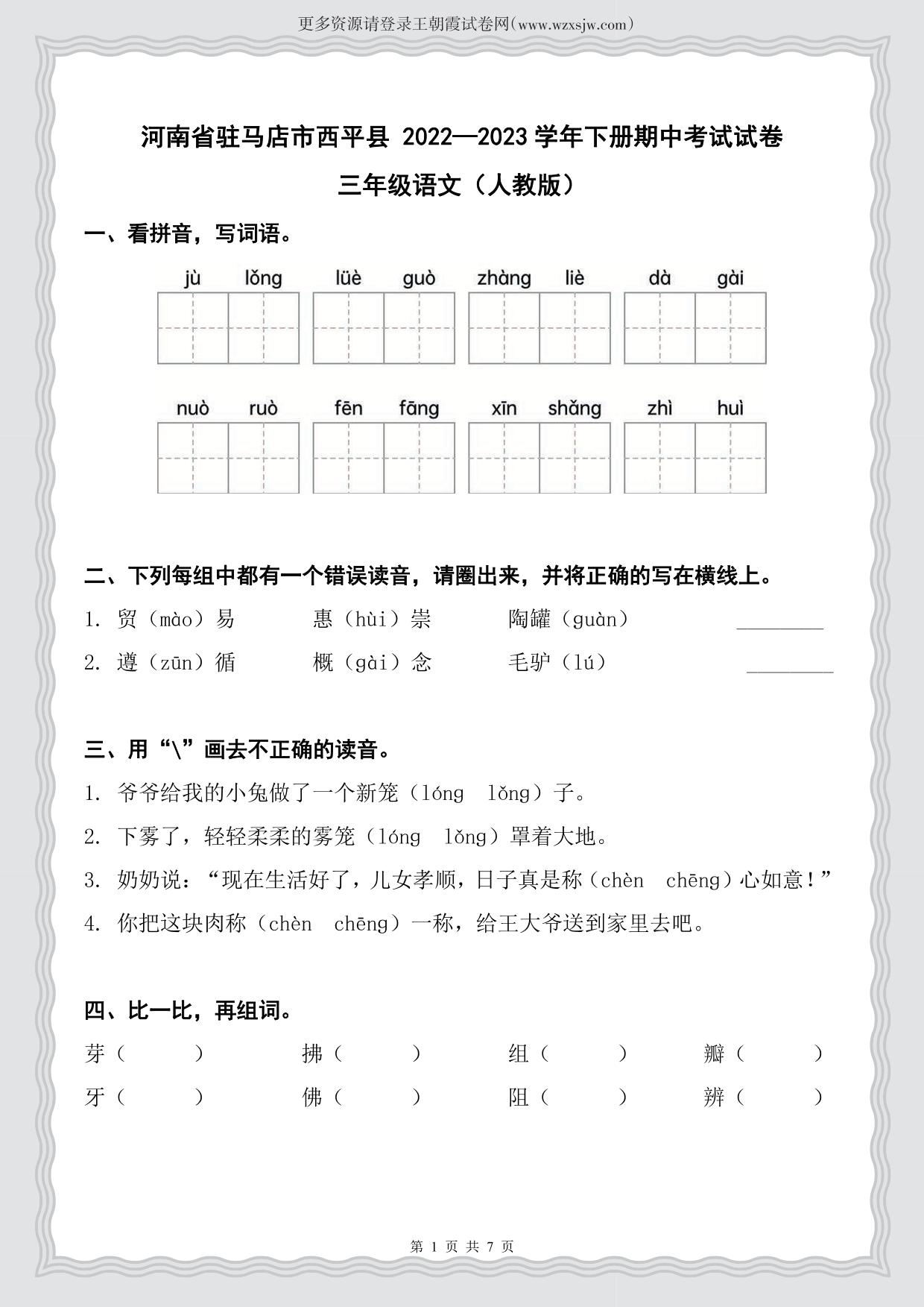 河南省驻马店市西平县 2022—2023学年下册期中考试试卷三年级语文(人教版)