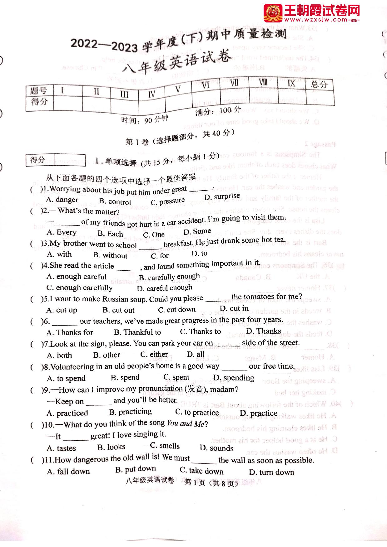八年级英语人教版下册期中卷