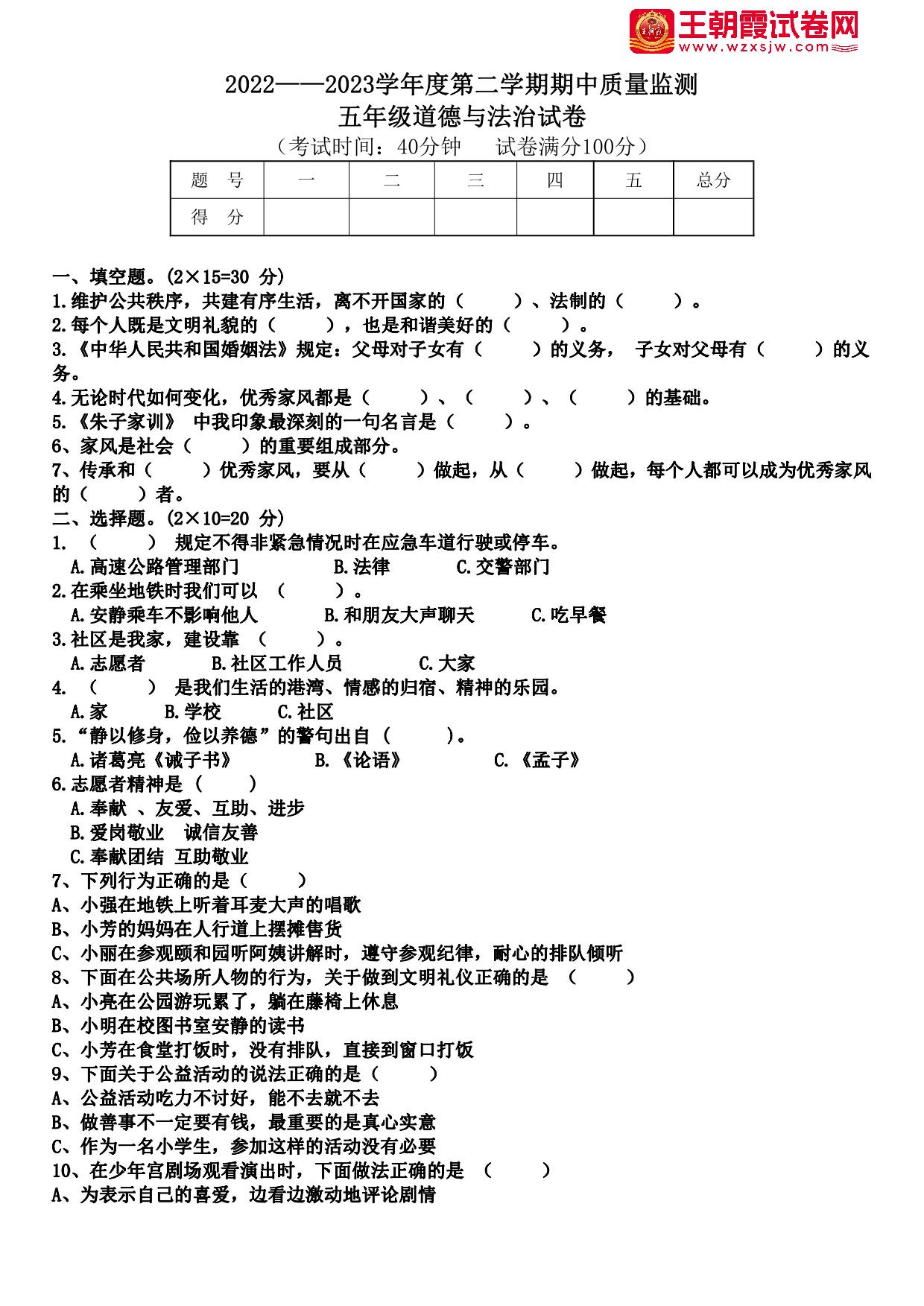 四年级道德与法治人教版下册期中卷