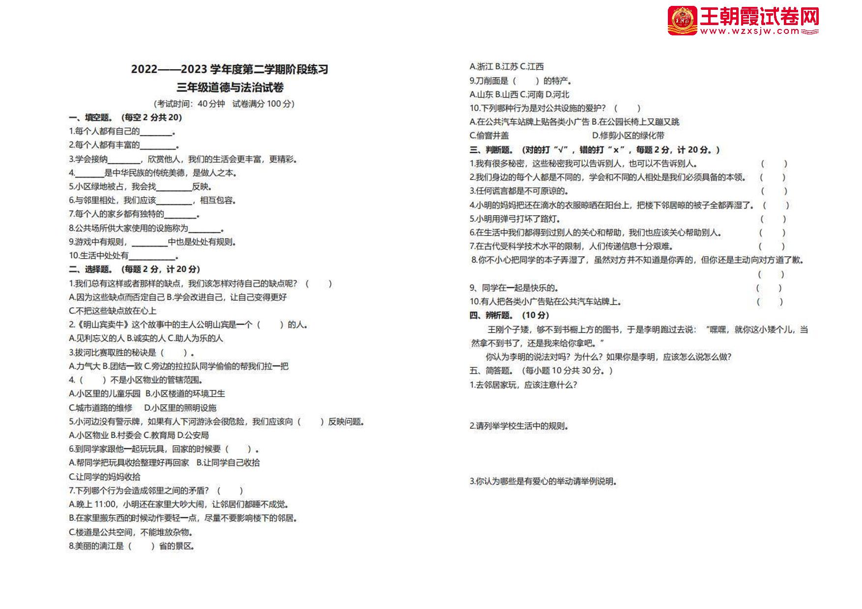 三年级道德与法治人教版下册月考卷