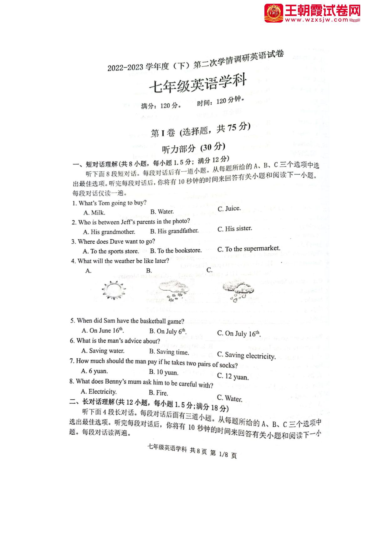 七年级英语人教版下册期中卷
