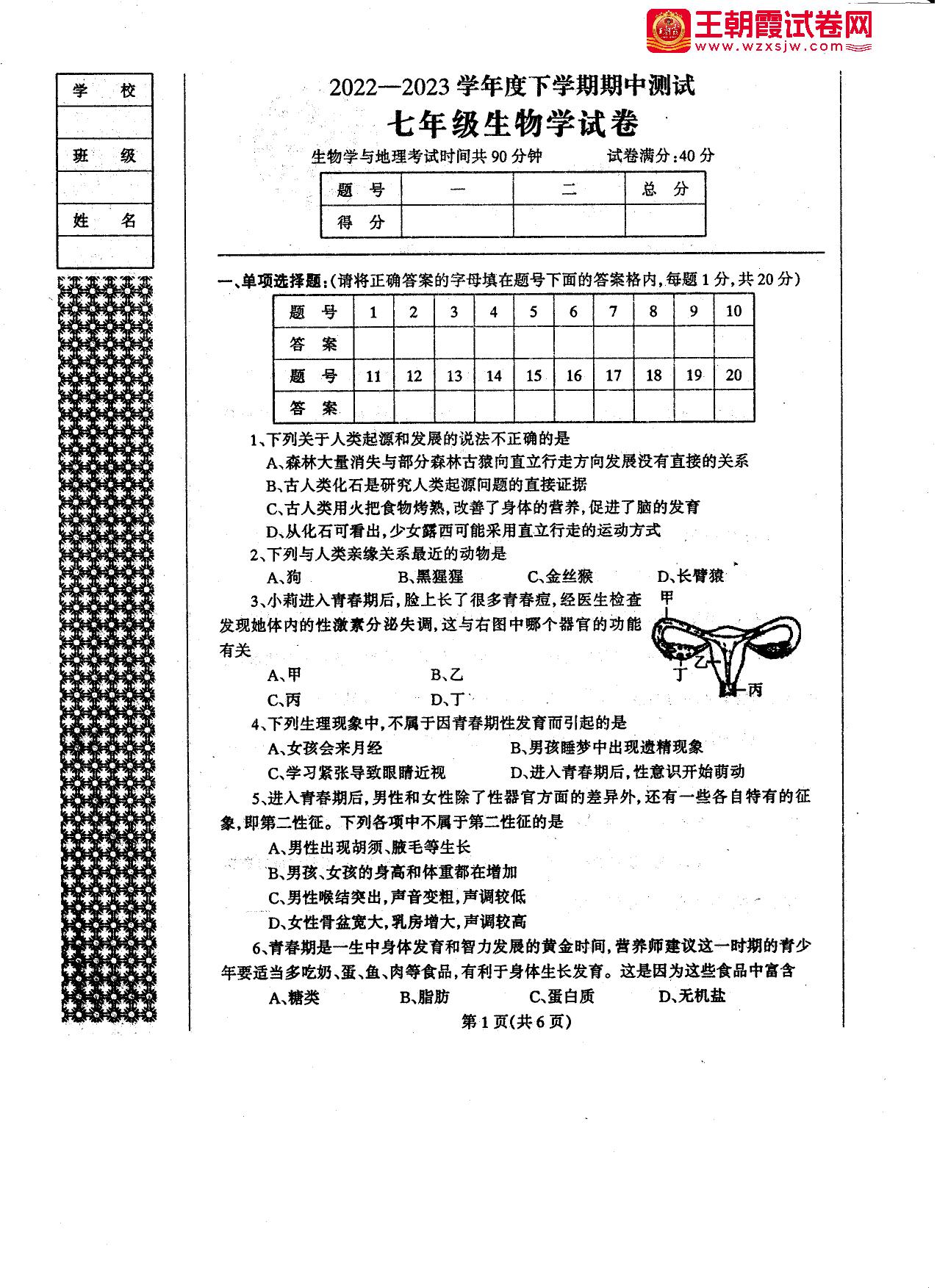 辽宁省丹东市凤城市2022-2023学年下学期期中测试试卷七年级生物(人教版)