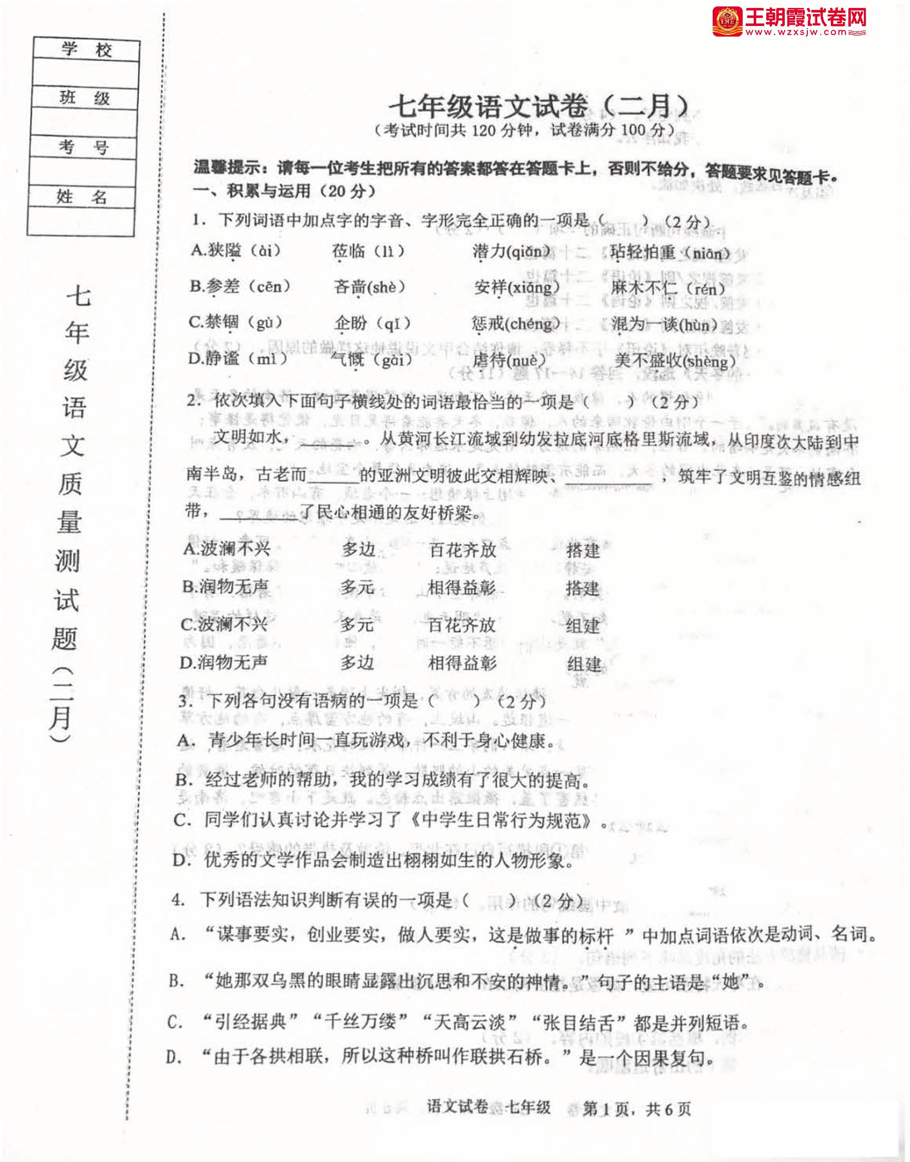 辽宁省鞍山铁西区2022-2023学年下学期2月月考试卷七年级语文(人教版)