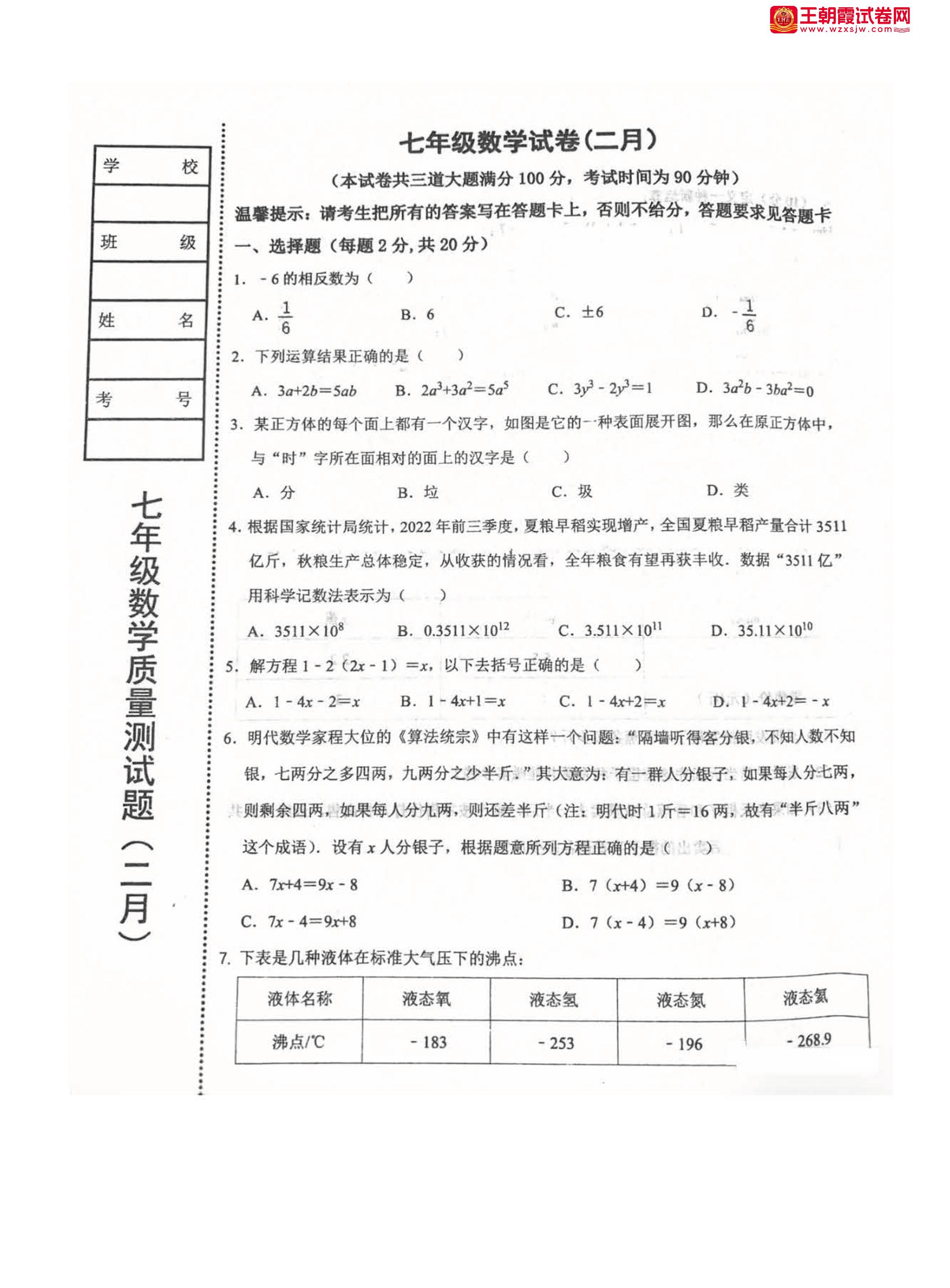 辽宁省鞍山铁西区2022-2023学年下学期2月月考试卷七年级数学(人教版)