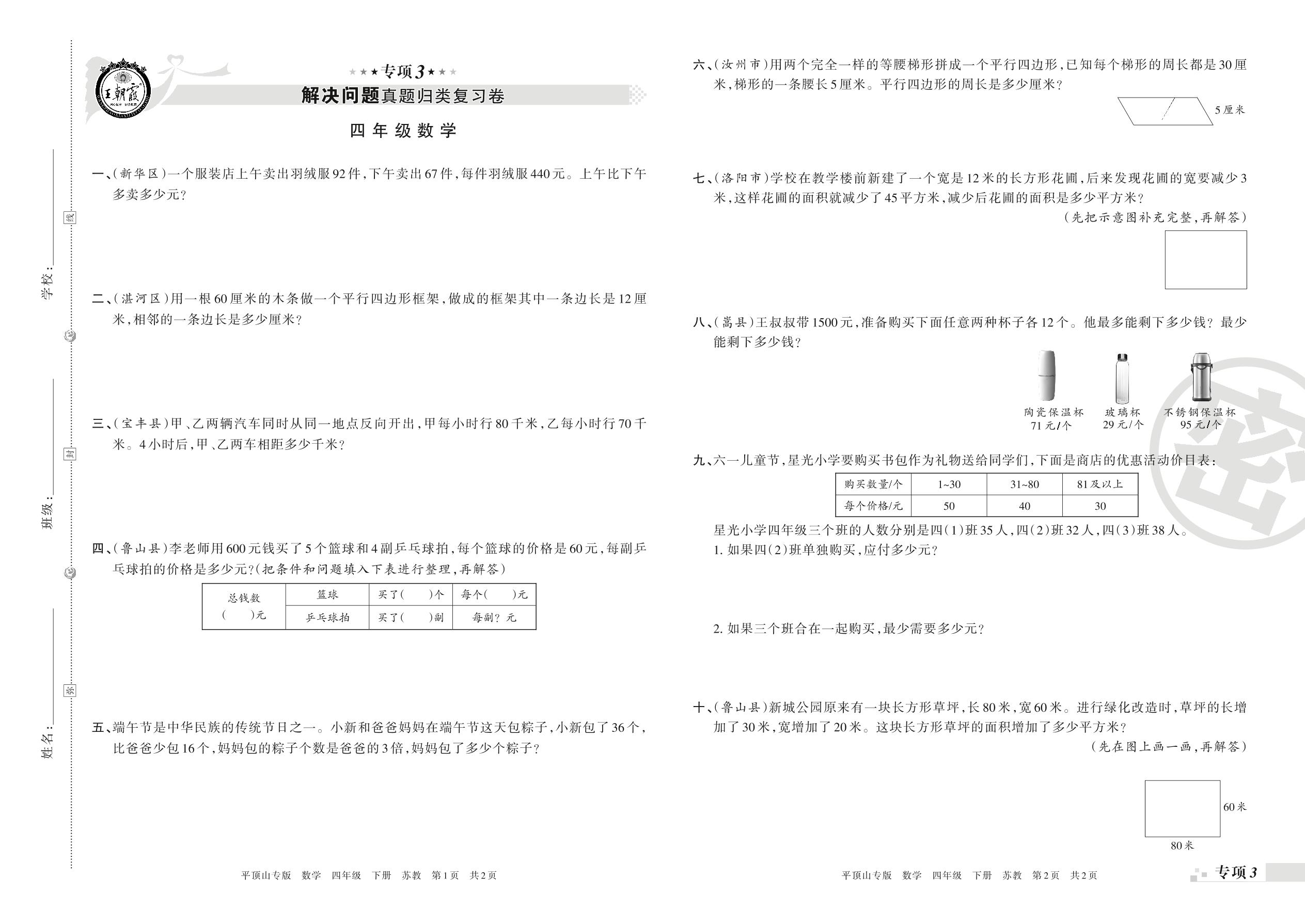 王朝霞期末专项卷——解决问题真题归类复习、新颖题速递:生活与数学四年级下册数学(苏教版)_R210804134413【0】