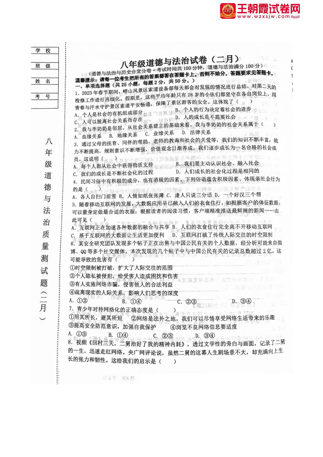 辽宁省鞍山市铁西区2022-2023学年下学期2月月考试卷八年级道德与法治(人教版)