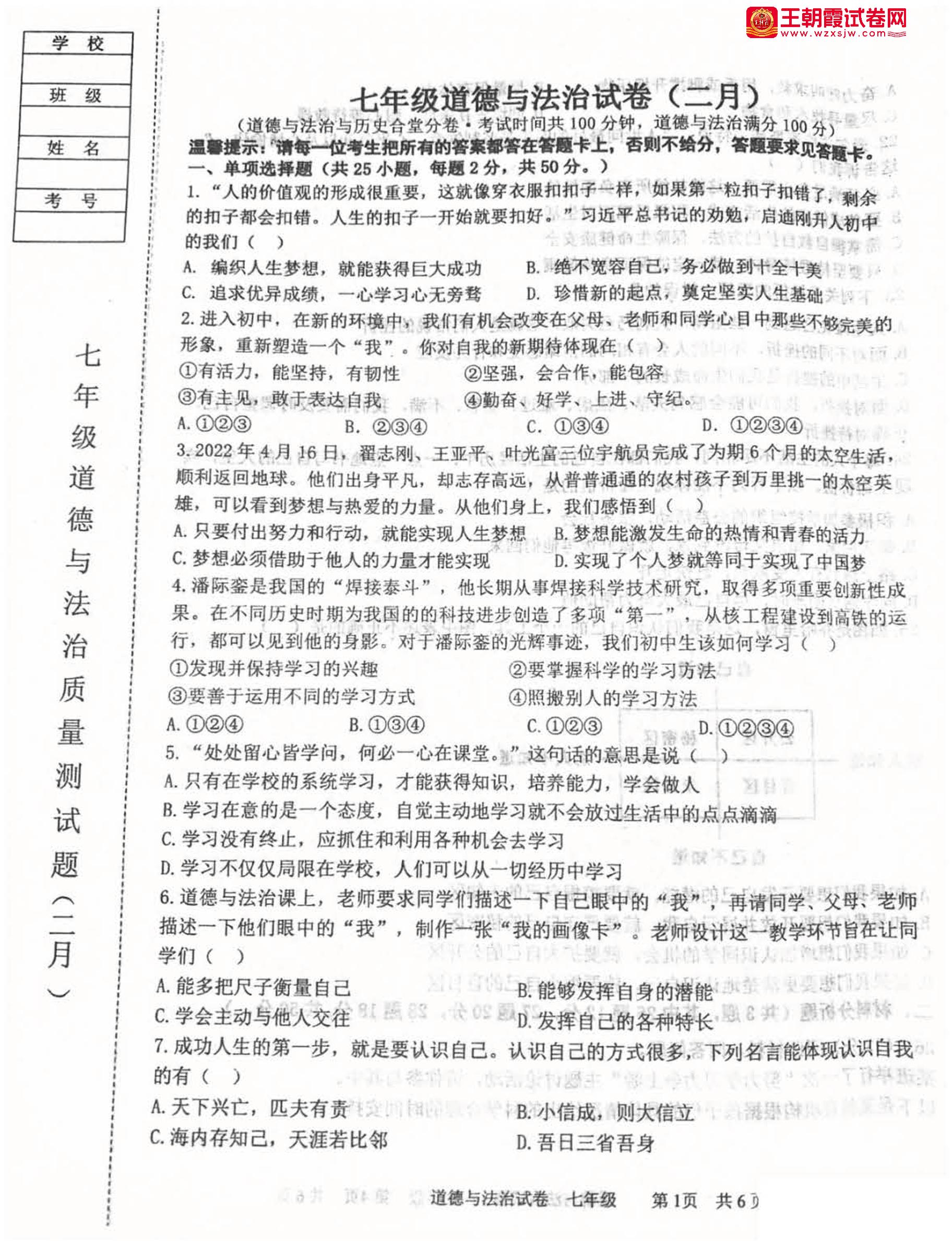 七年级道德与法治人教版下册月考卷