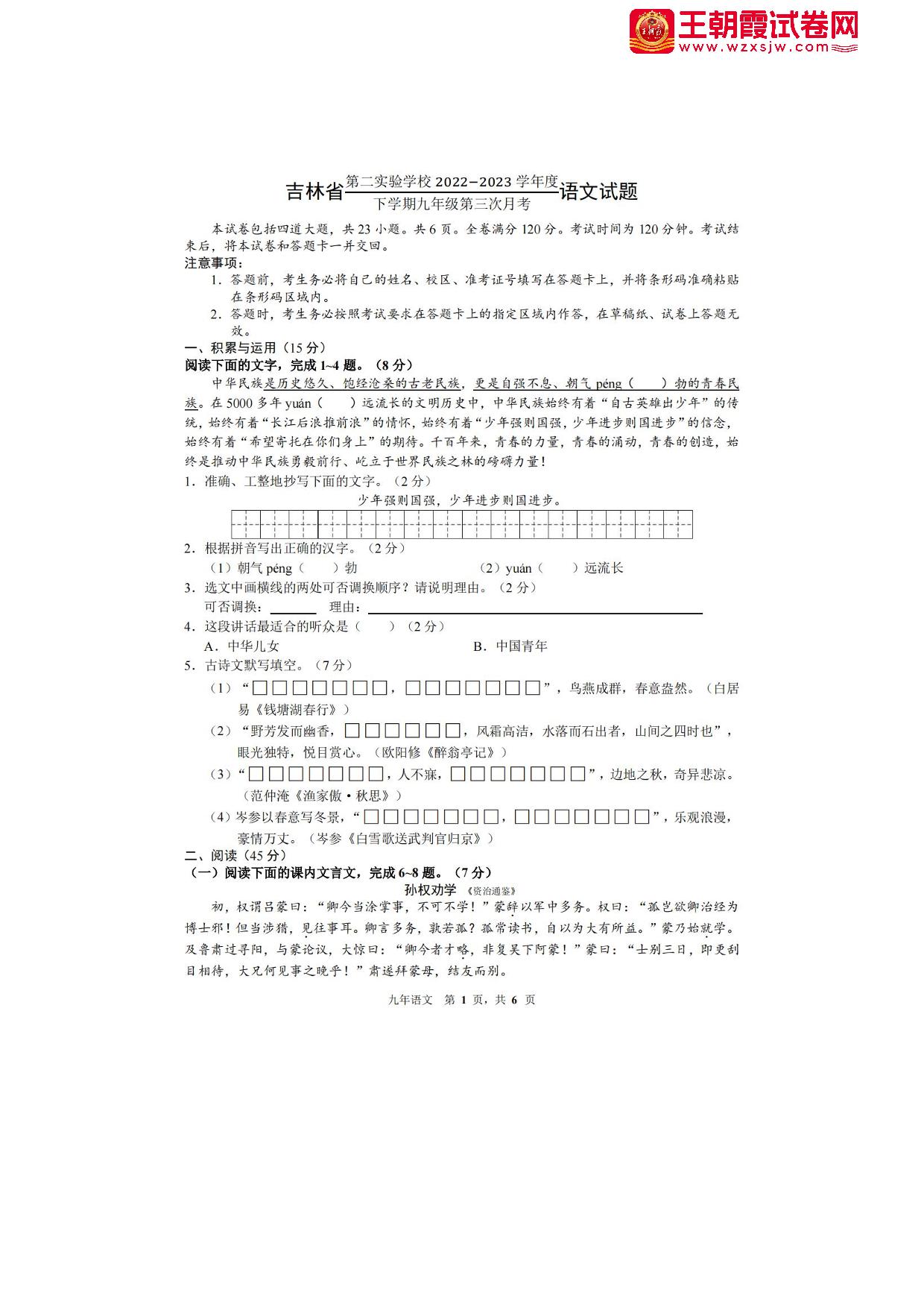 吉林省第二实验学校2022-2023学年下学期第三次月考试卷九年级语文(人教版)