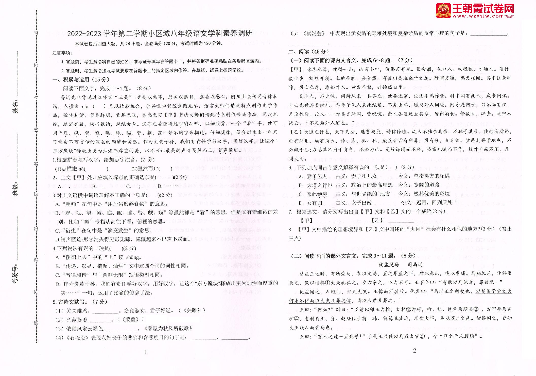 吉林省长春市汽车经济技术开发区小区域联考2022-2023学年下学期期中考试试卷八年级语文(人教版)