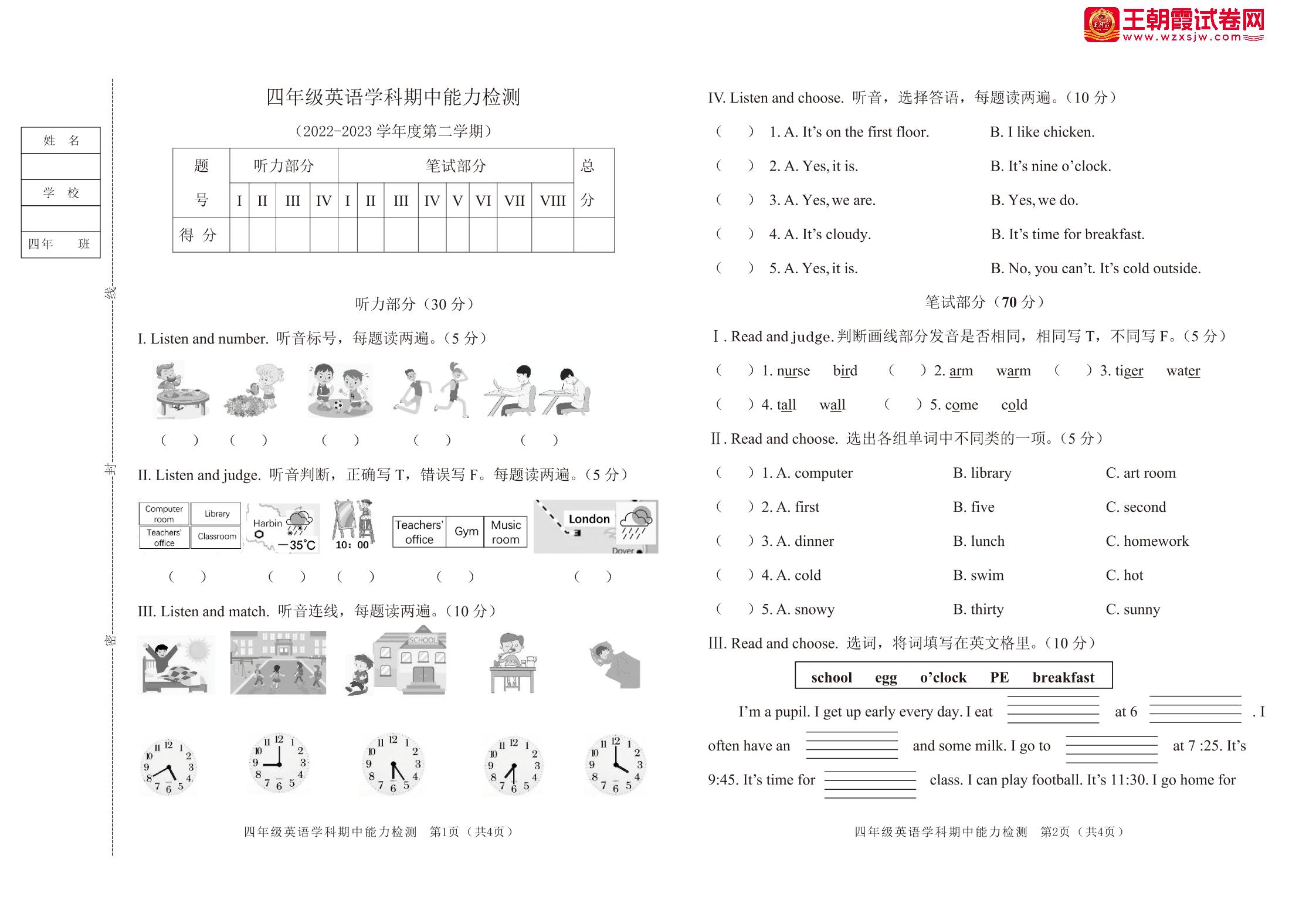 吉林省四平市铁西区2022-2023学年下学期期中考试试题四年级英语(PEP版)