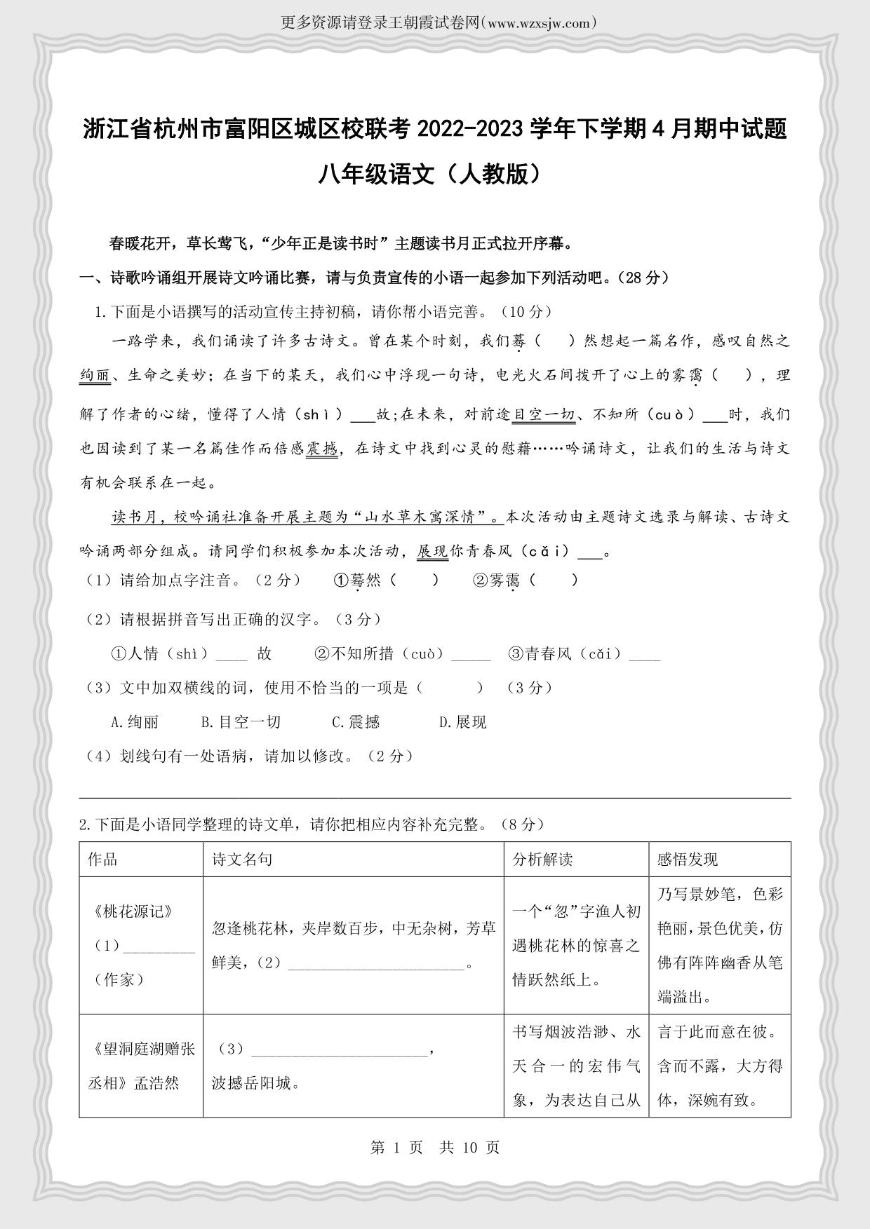 浙江省杭州市富阳区城区校联考2022-2023学年下学期4月期中试题八年级语文(人教版)