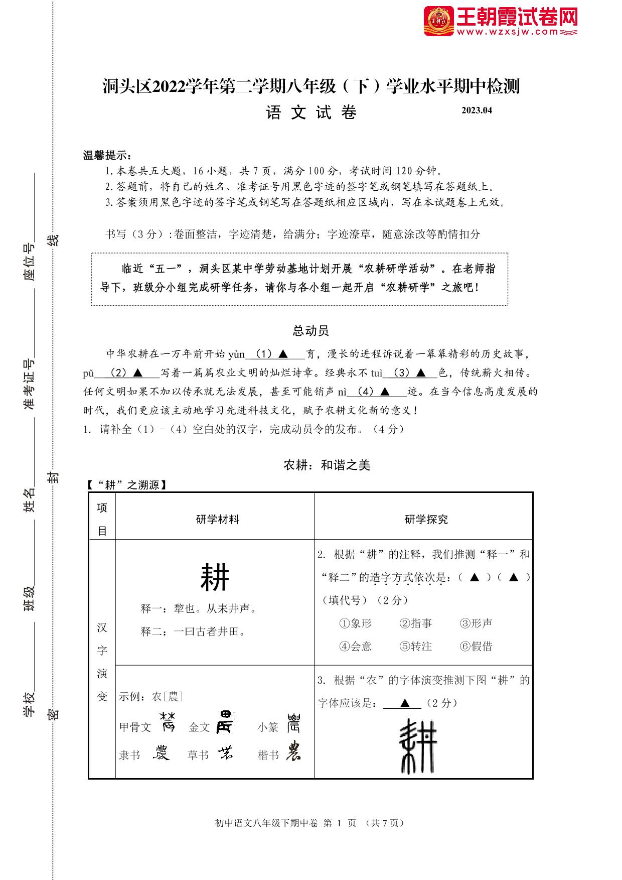 浙江省温州市洞头区 2022-2023 学年第二学期学业水平期中检测八年级语文(人教版)