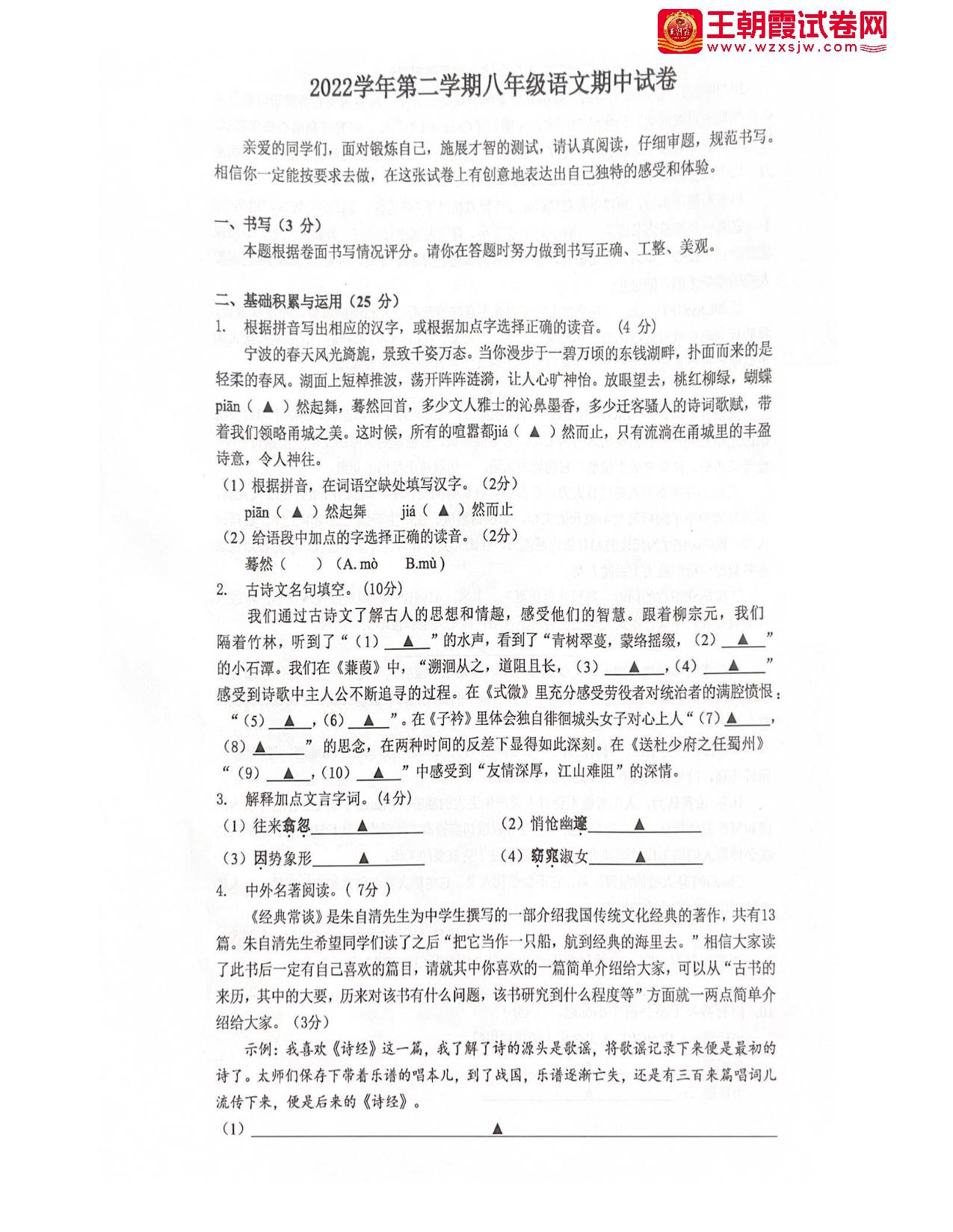 浙江省宁波市海曙区十校联考2022-2023学年下学期4月期中试题八年级语文(人教版)