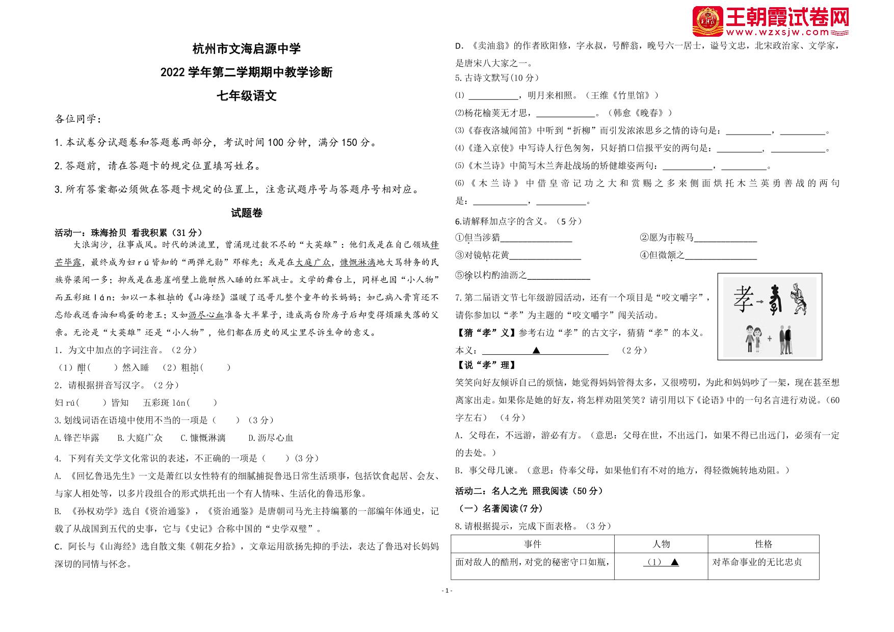 浙江省杭州市钱塘区启源中学2022-2023学年下学期期中考卷七年级语文(人教版)