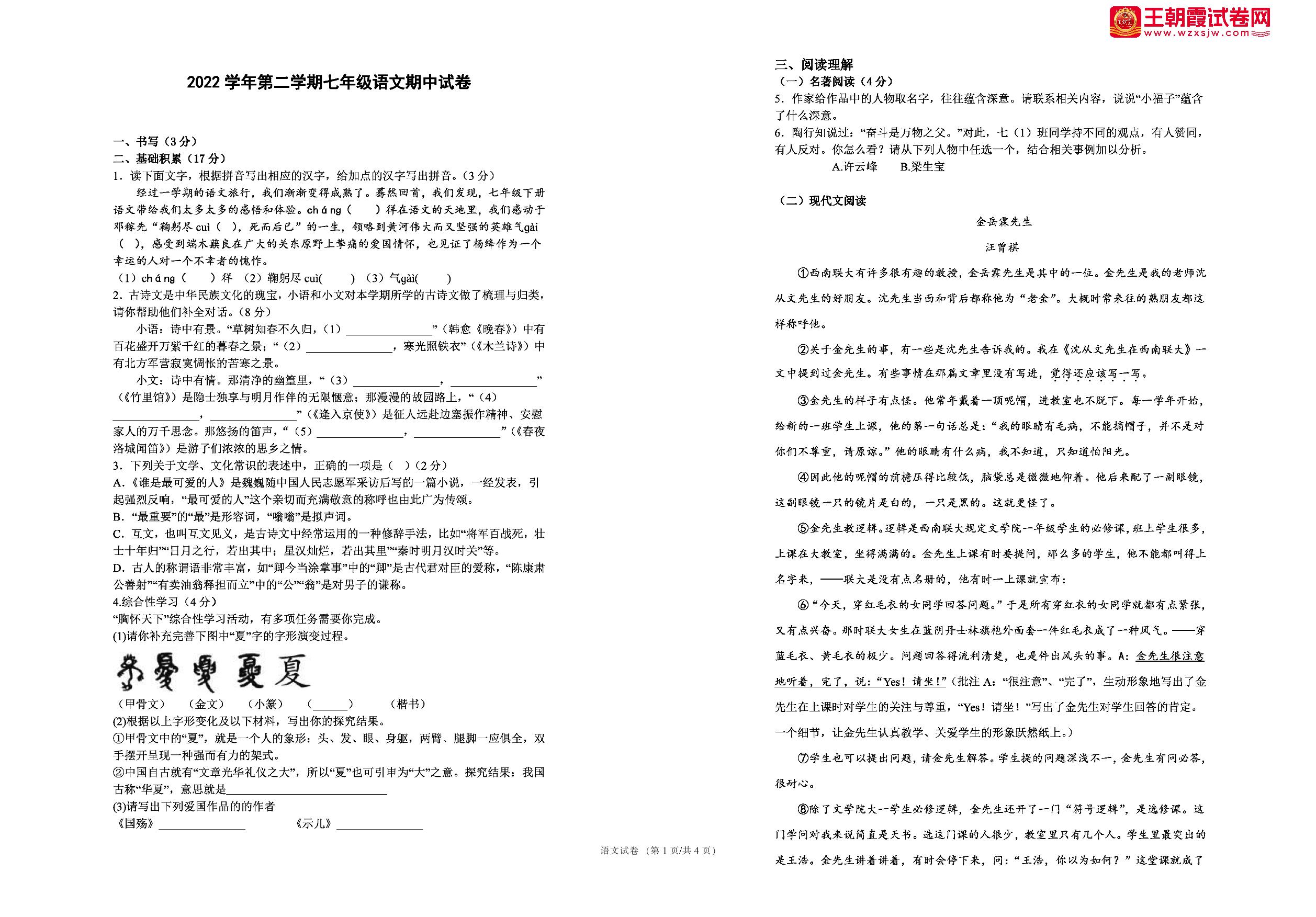 浙江省宁波市海曙区2022-2023学年下学期期中试题七年级语文(人教版)