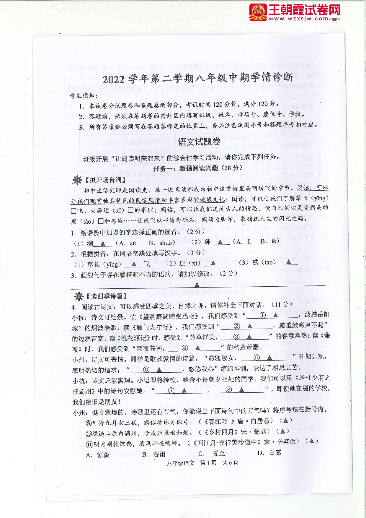 浙江省杭州市余杭区2022-2023学年下学期期中试题八年级语文(人教版)