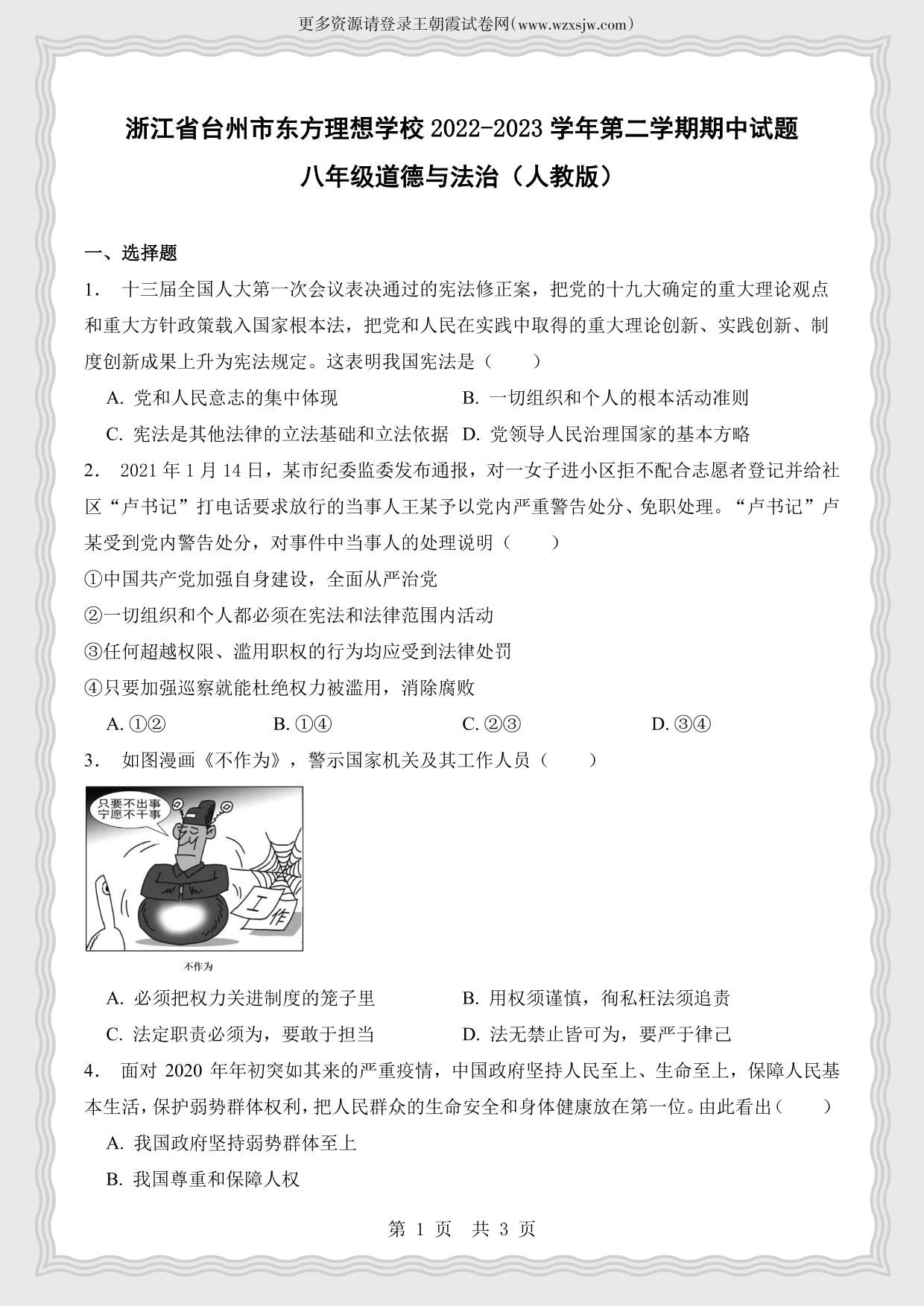 浙江省台州市东方理想学校2022-2023学年第二学期期中试题八年级道德与法治(人教版)