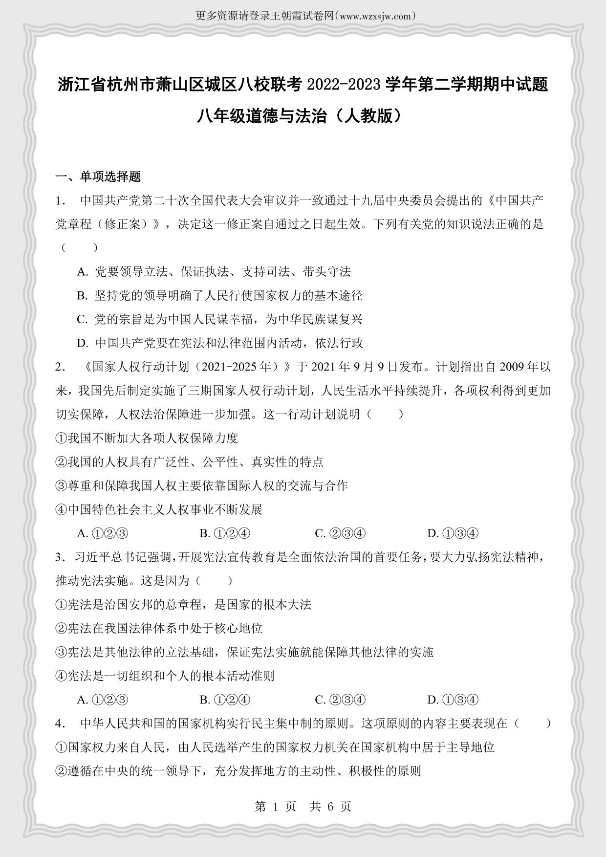 浙江省杭州市萧山区城区八校联考2022-2023学年第二学期期中试题八年级道德与法治(人教版)