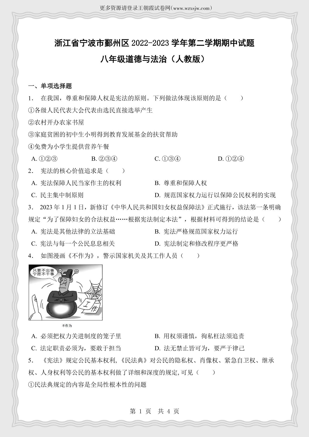 浙江省宁波市鄞州区2022-2023学年第二学期期中试题八年级道德与法治(人教版)