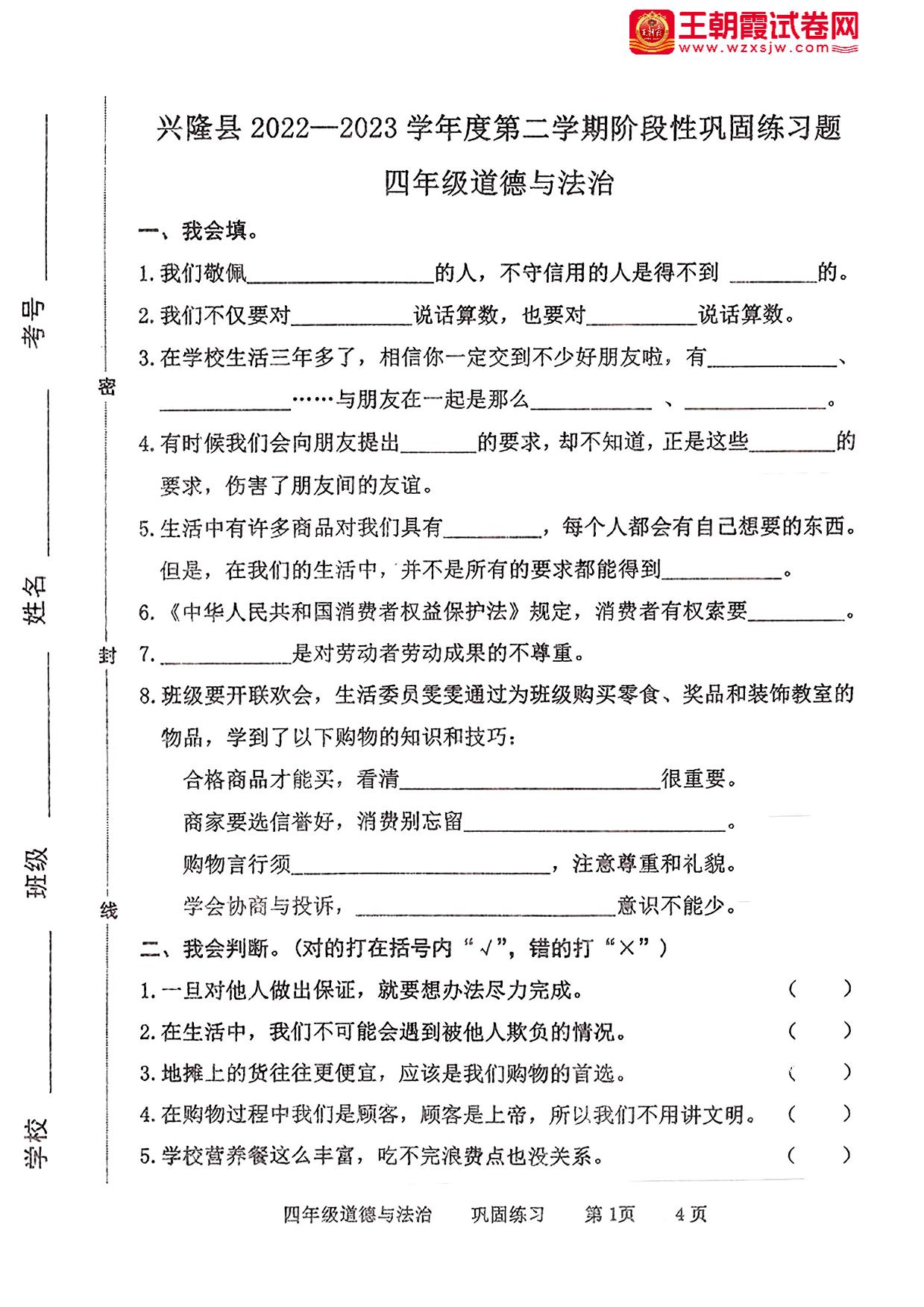 河北省承德市兴隆县2022-2023学年度第二学期阶段性巩固练习期中试卷四年级道德与法治(人教版)