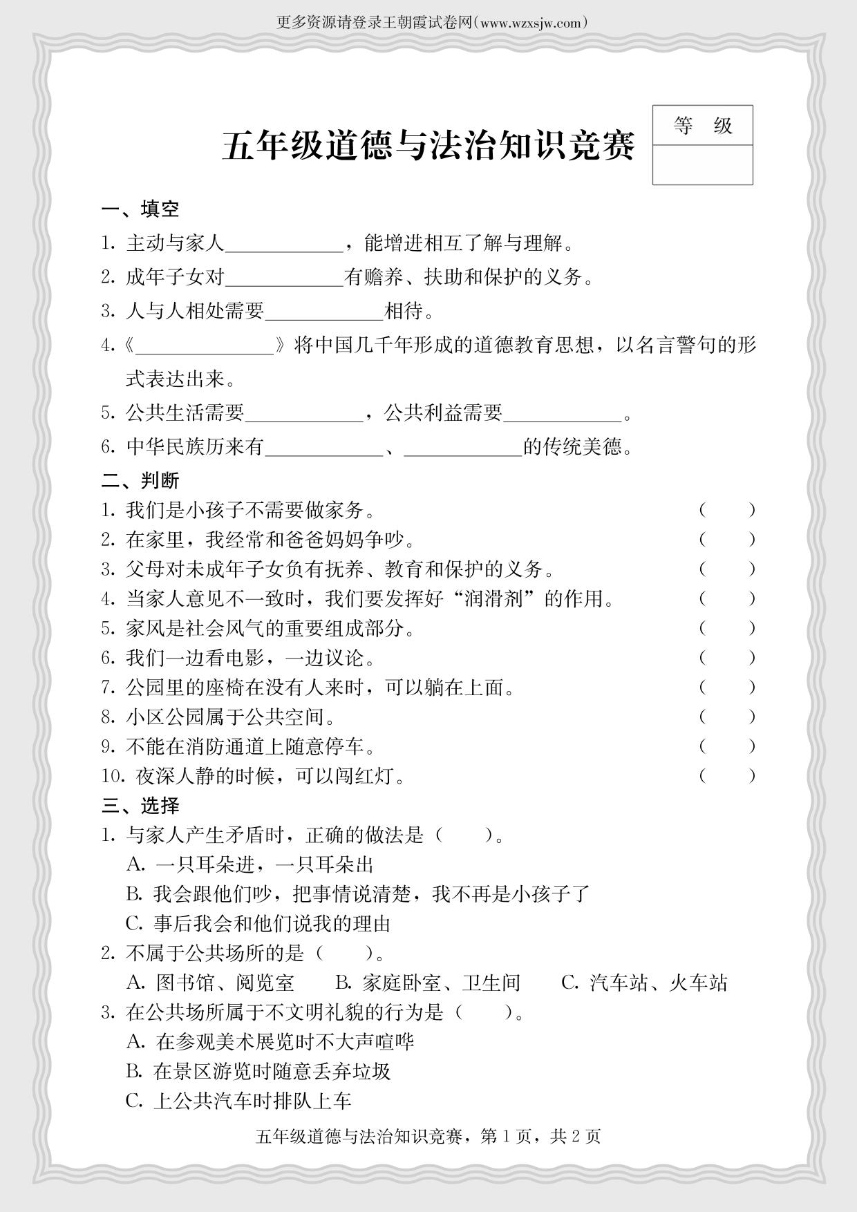 河北省石家庄市高邑县2022-2023学年度第二学期知识竞赛(期中)试卷五年级道德与法治(人教版)