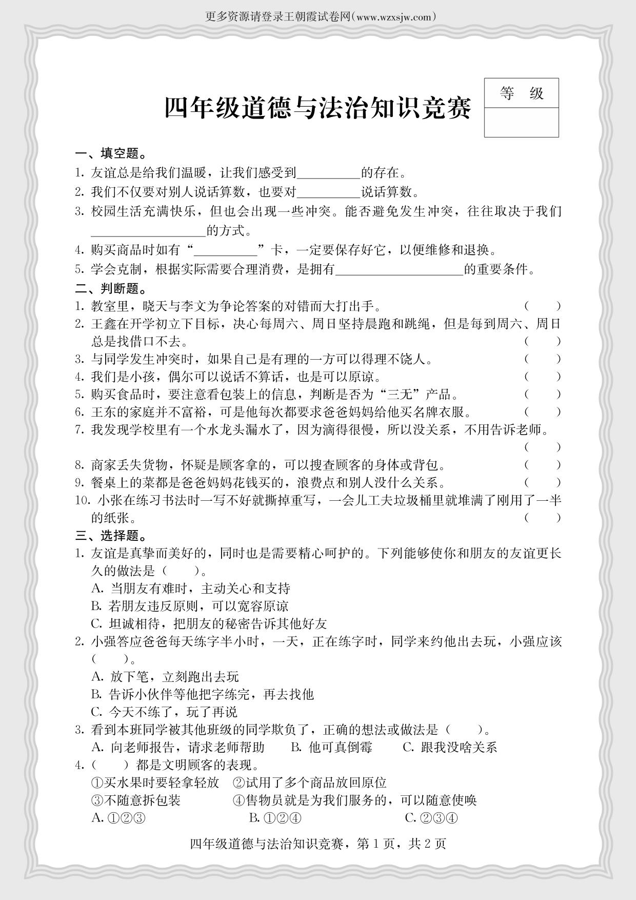 河北省石家庄市高邑县2022-2023学年度第二学期知识竞赛(期中)试卷四年级道德与法治(人教版)